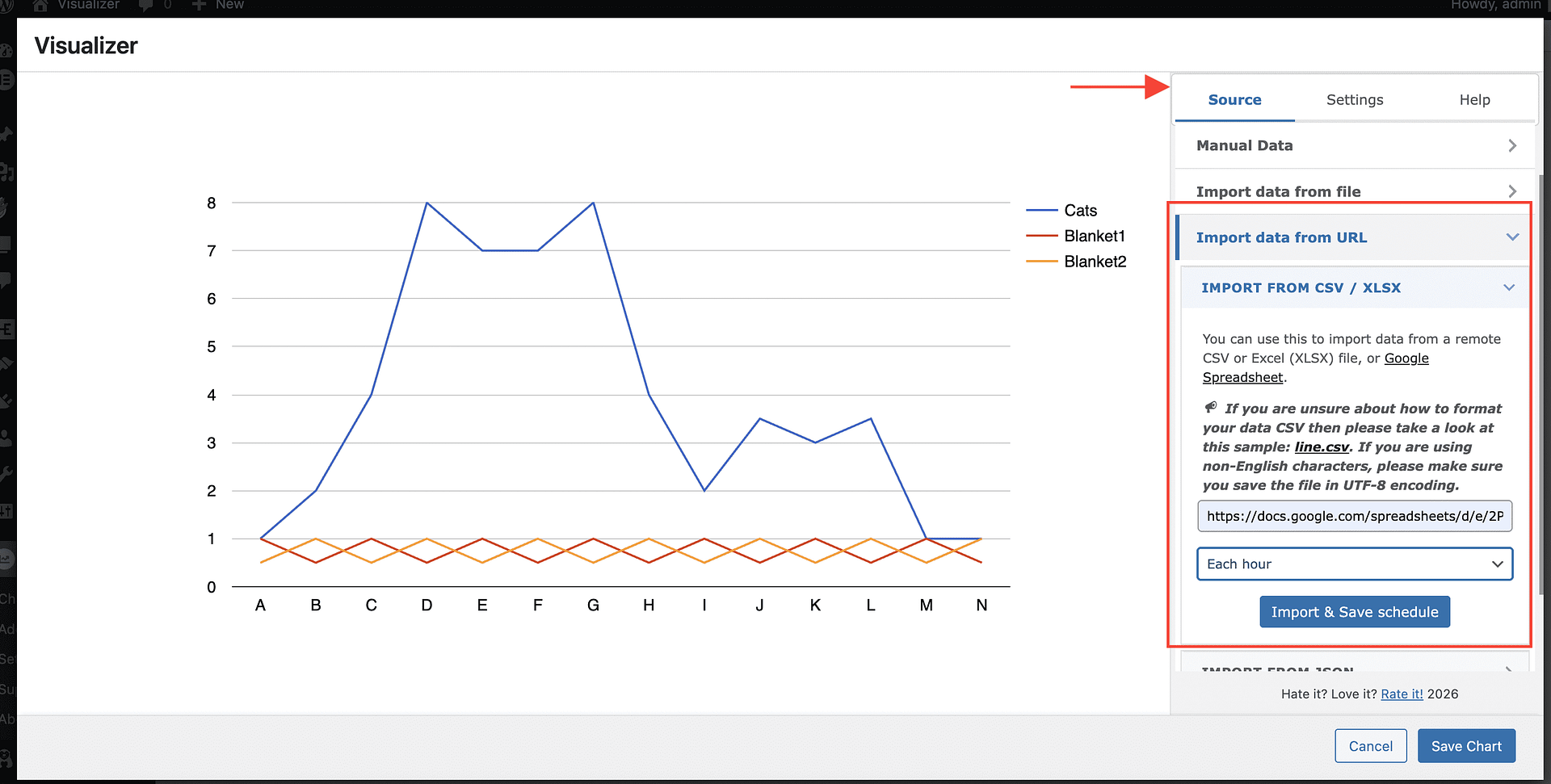 3. Under the Source tab, expand Import data from URL and Import from CSV / XLSX.