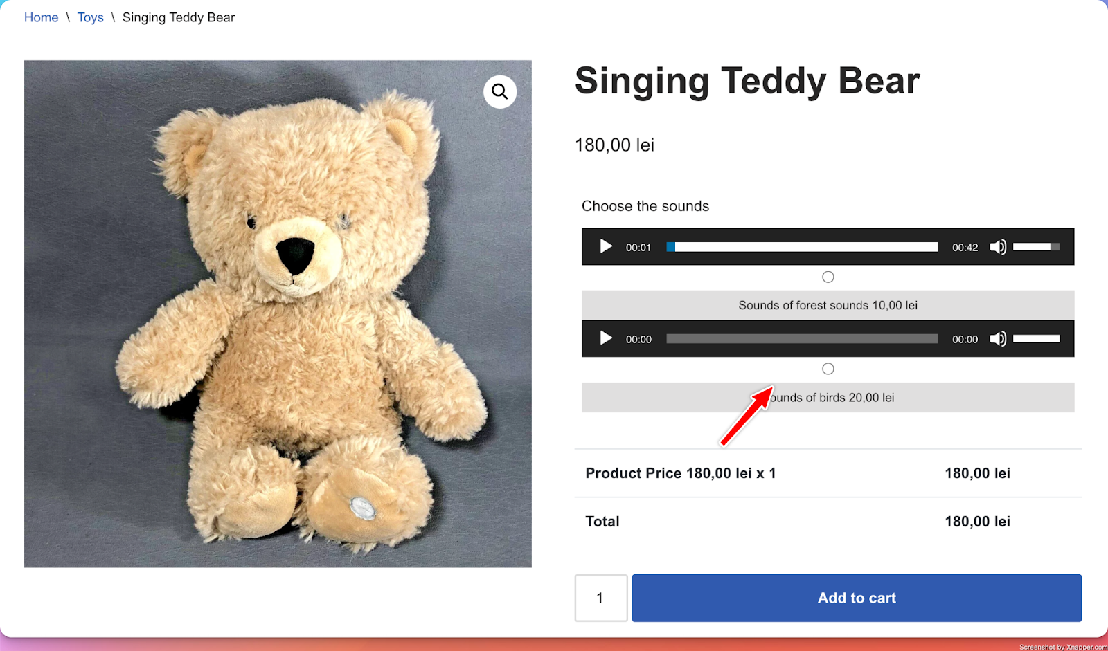 - Adding a different number of different types of flowers to a flower arrangement, which has a base price. You can add 10 roses ( each for 10 lei ), 2 lilies ( each for 20 lei ), and so on, which gets added to the base price of the product.