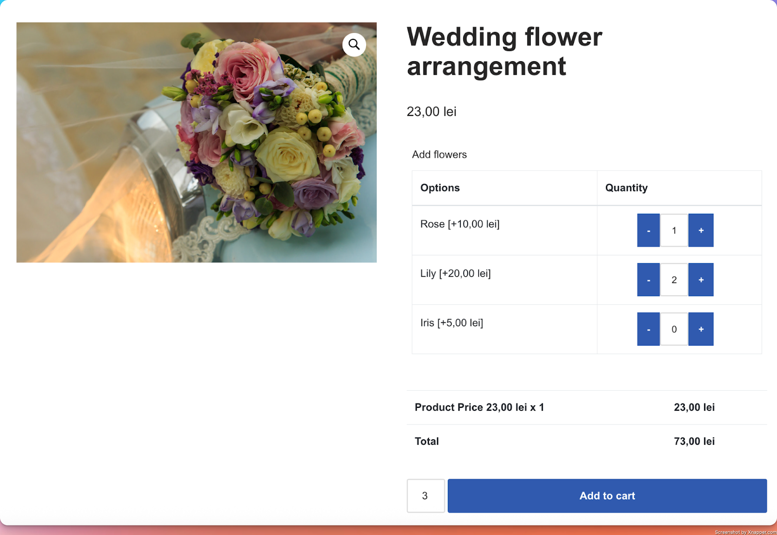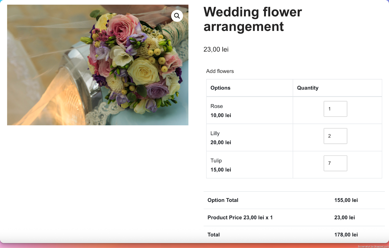 - Adding a different number of different types of flowers to a flower arrangement, which has a base price. You can add 10 roses ( each for 10 lei ), 2 lilies ( each for 20 lei ), and so on, which gets added to the base price of the product. For each flower, you can display the corresponding image by adding its attachment ID from the Media Library.