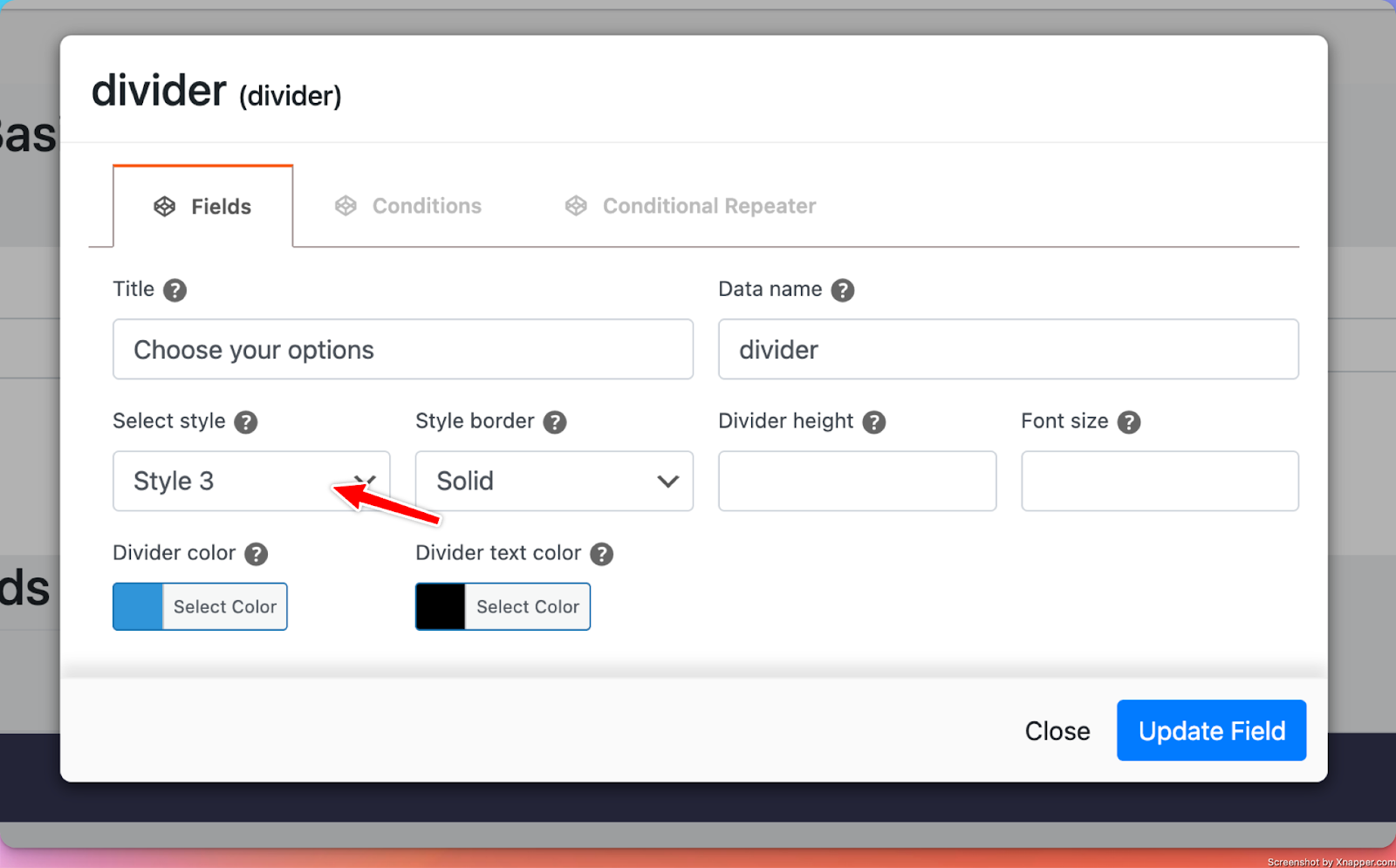 - The Divider field is a special type of field that can be used to visually differentiate other fields.