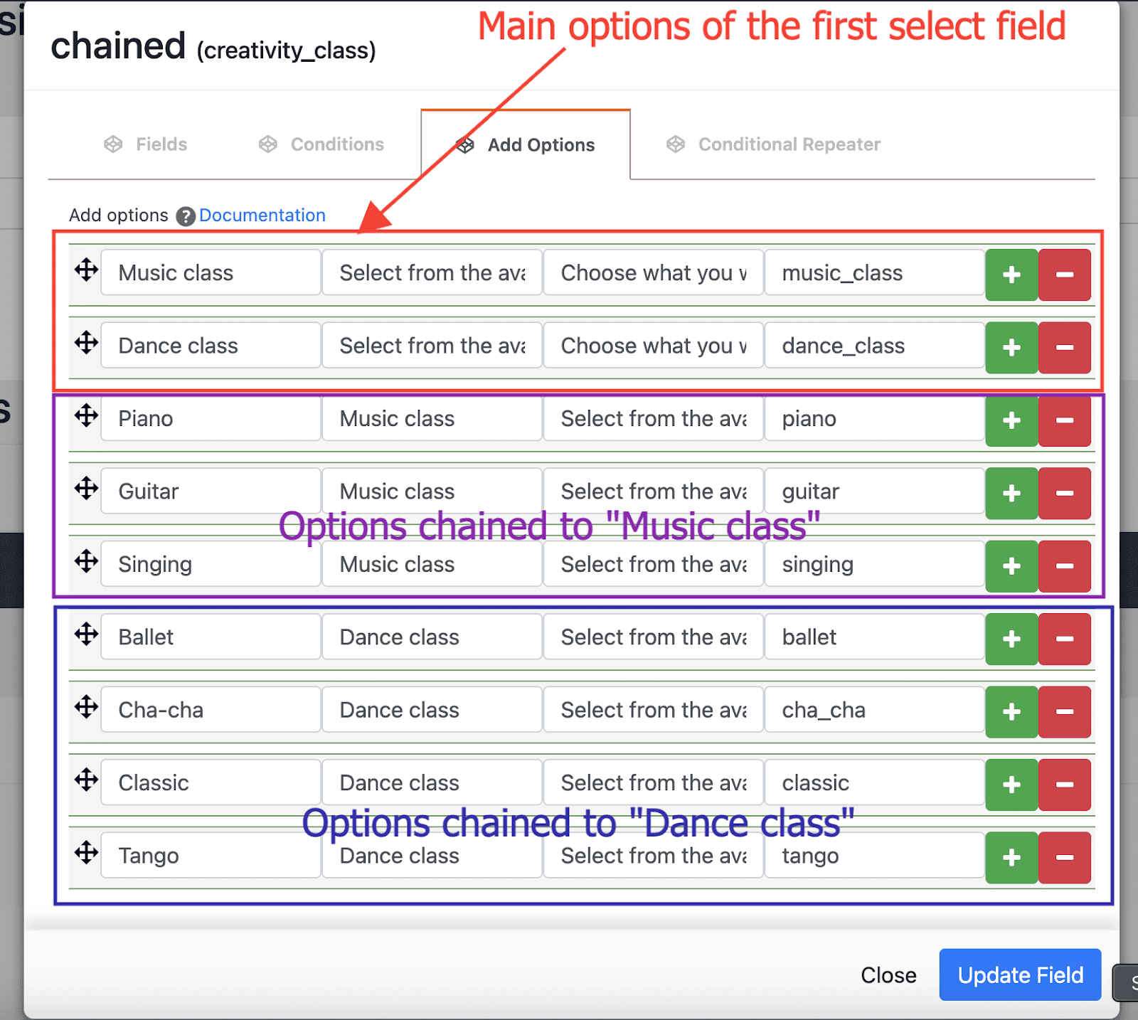 - Adds a sequence of chained ( connected ) select fields. The options of one select field are available based on what the user selects in the previous select field.
