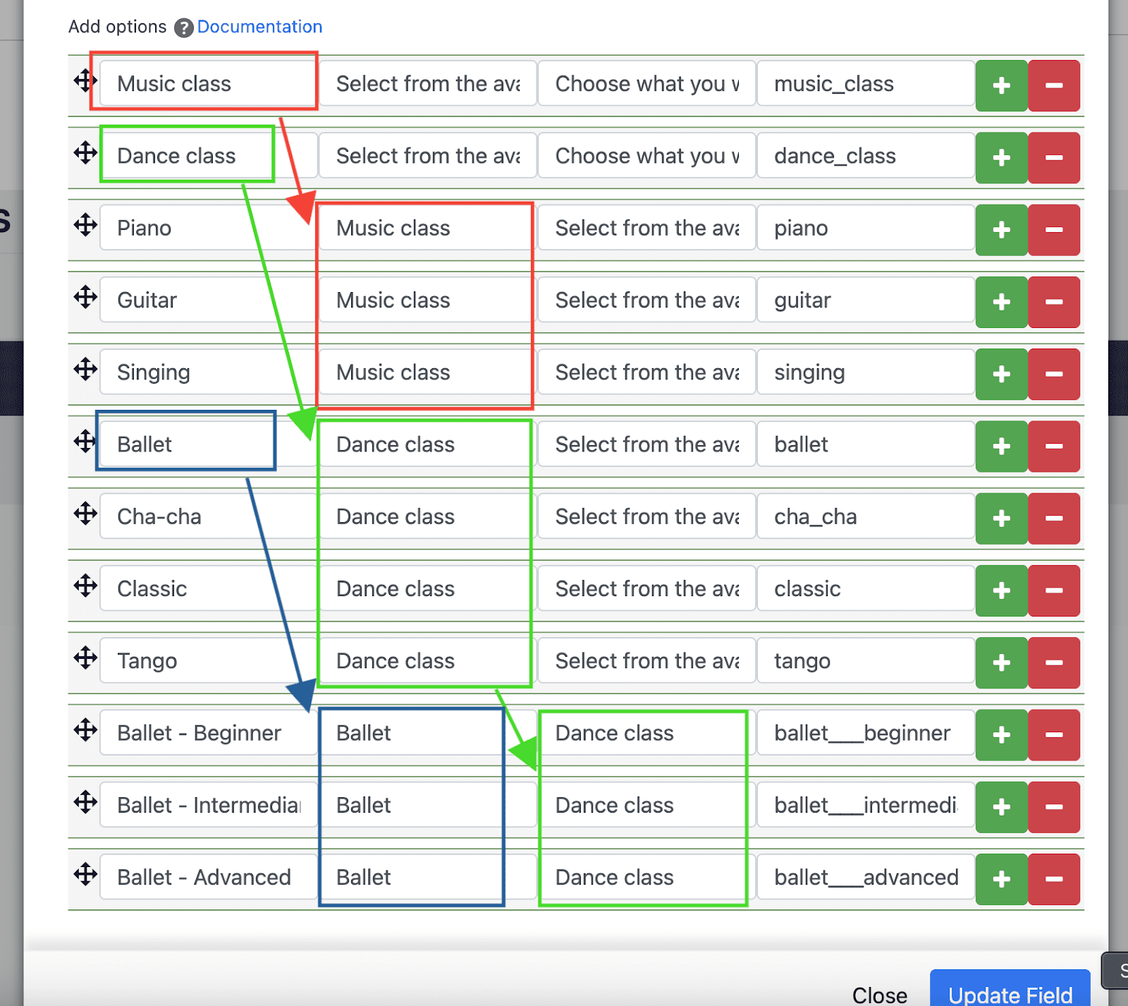 - Let users make selections based on specific conditions. For example, allow them to select from a list of types of activities ( dance or music ), and based on their selection, allow them to select specific activities ( if they choose dance, they can choose either ballet or tango, while if they choose music, they can choose either piano, guitar, or drums ).