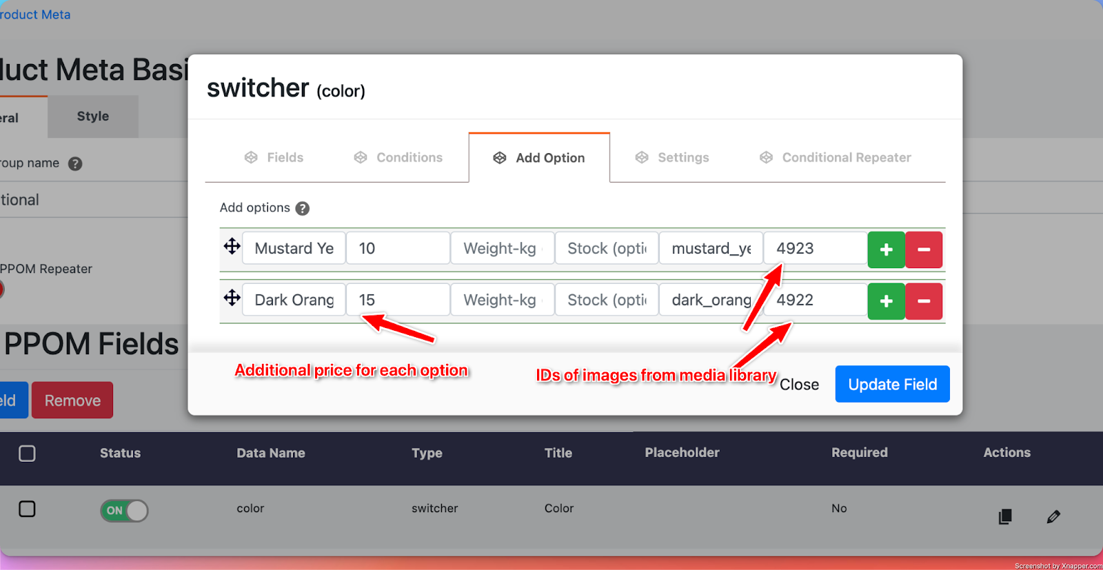 When adding options, you have the option to add Add-on prices (additional pricing for each option) and images. ( For images, you need to get their IDs from the media library ).