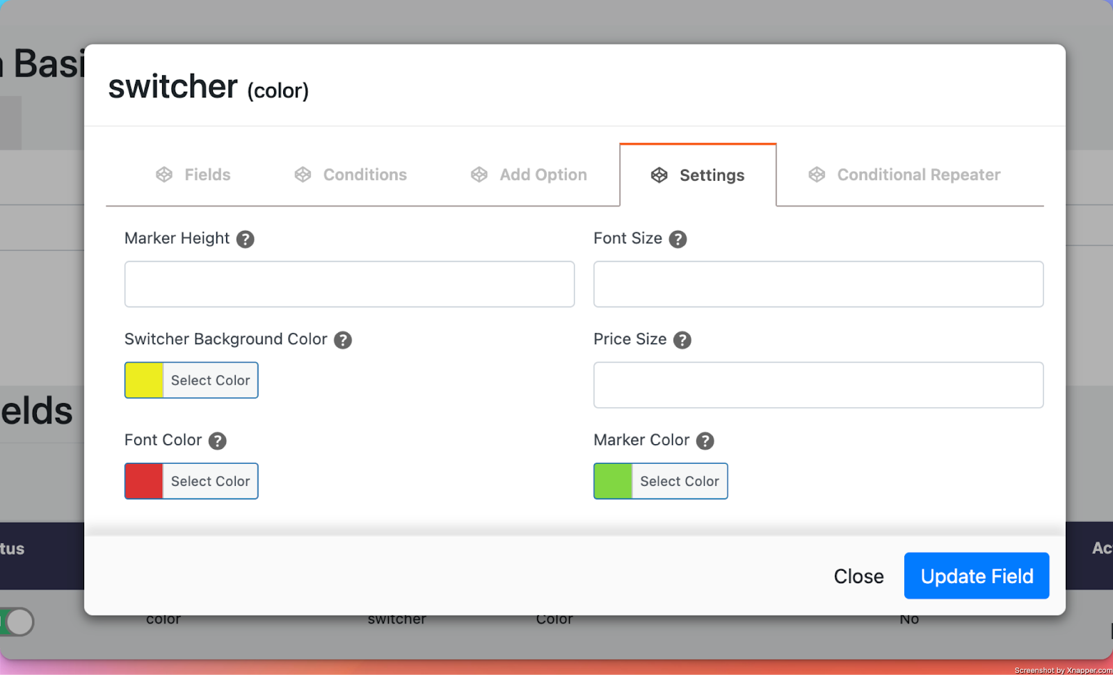 - Advanced: The border color for the selected option, Show colors as circles or squares, Allow multiple selected colors or not.