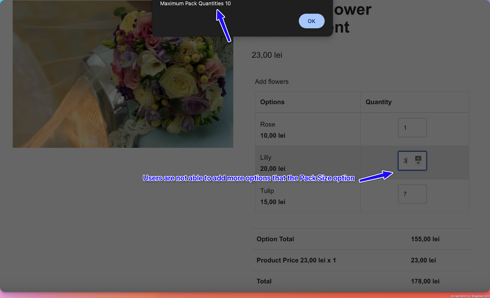 - Adding a different number of different types of flowers to a flower arrangement, which has a base price. You can add 10 roses ( each for 10 lei ), 2 lilies ( each for 20 lei ), and so on, which gets added to the base price of the product. But you are limited in the number of flowers you can add by the value of the Pack Size.