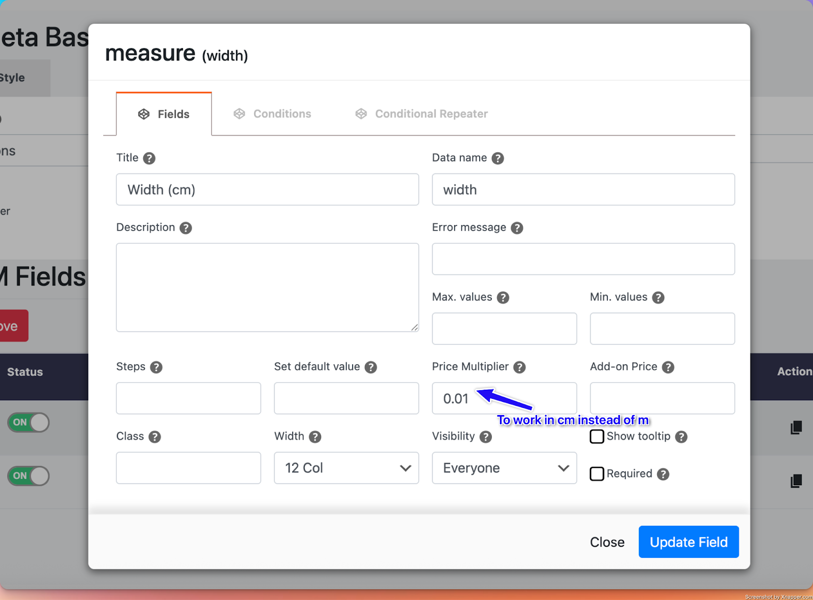 - Advanced: Price multiplier (adjusting the price depending on the measurements <m or cm, for example)