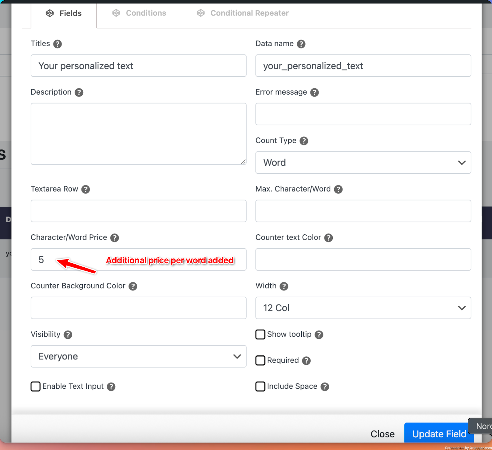 π Note: Not all the inputs can be added here. Here is a list with the approved ones: Select, Text, Divider, Fonts, Domain, Chained, Quantities, Phone, Color, Emojis, Personalization Preview, Fixed Price, Image Select, Super List, Radio Switcher, Color Picker, Timezone, Price Matrix, Audio/Video, Radio Select, Number, Checkbox, Measure Input, Email, Text Counter, Image Dropdown.