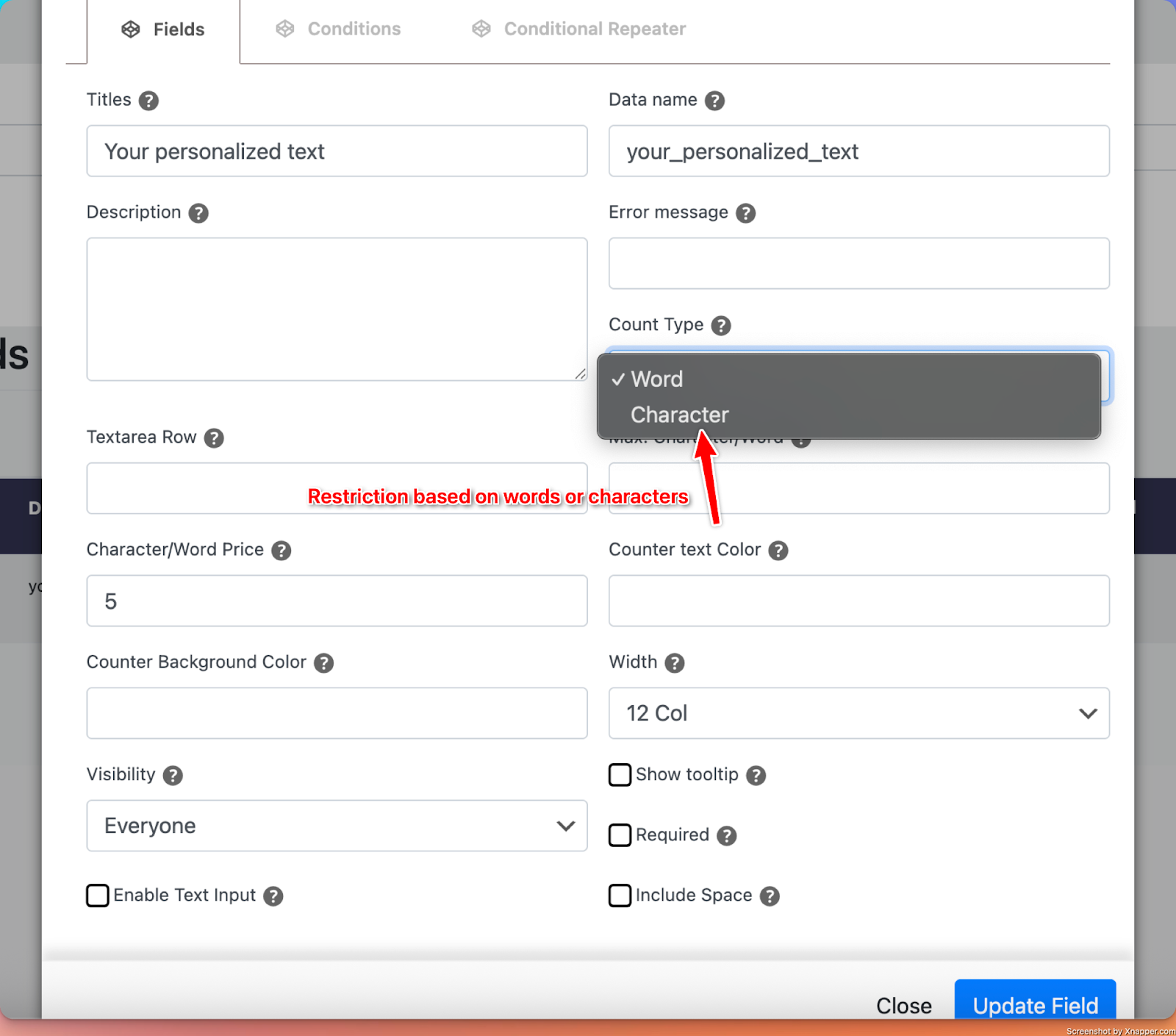 Count Type: Ability to choose to limit the text based on the number of characters or the number of words.