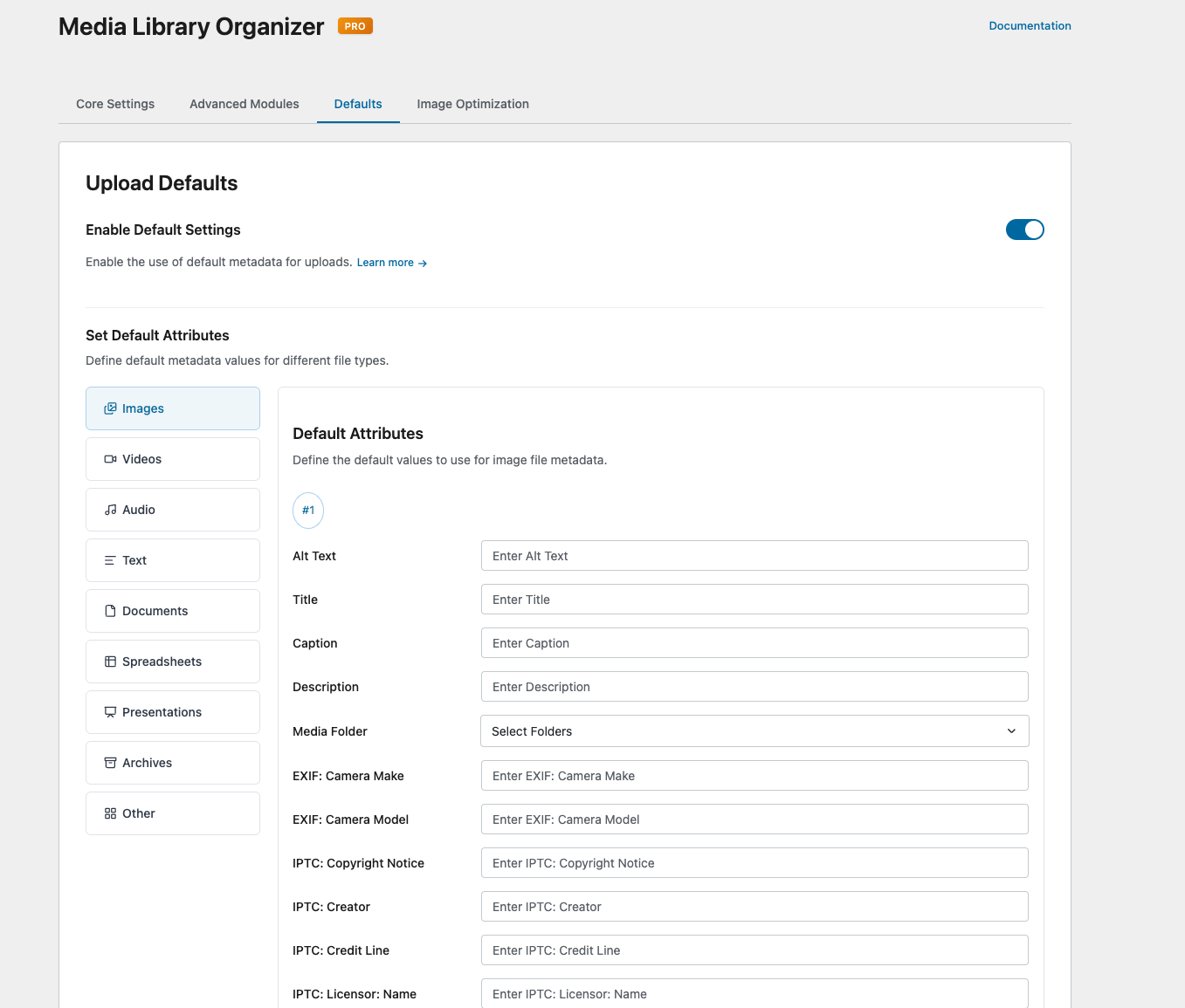 - Caption: Assigns the specified Caption to Images files uploaded to the Media Library, where no Caption is specified with the upload.