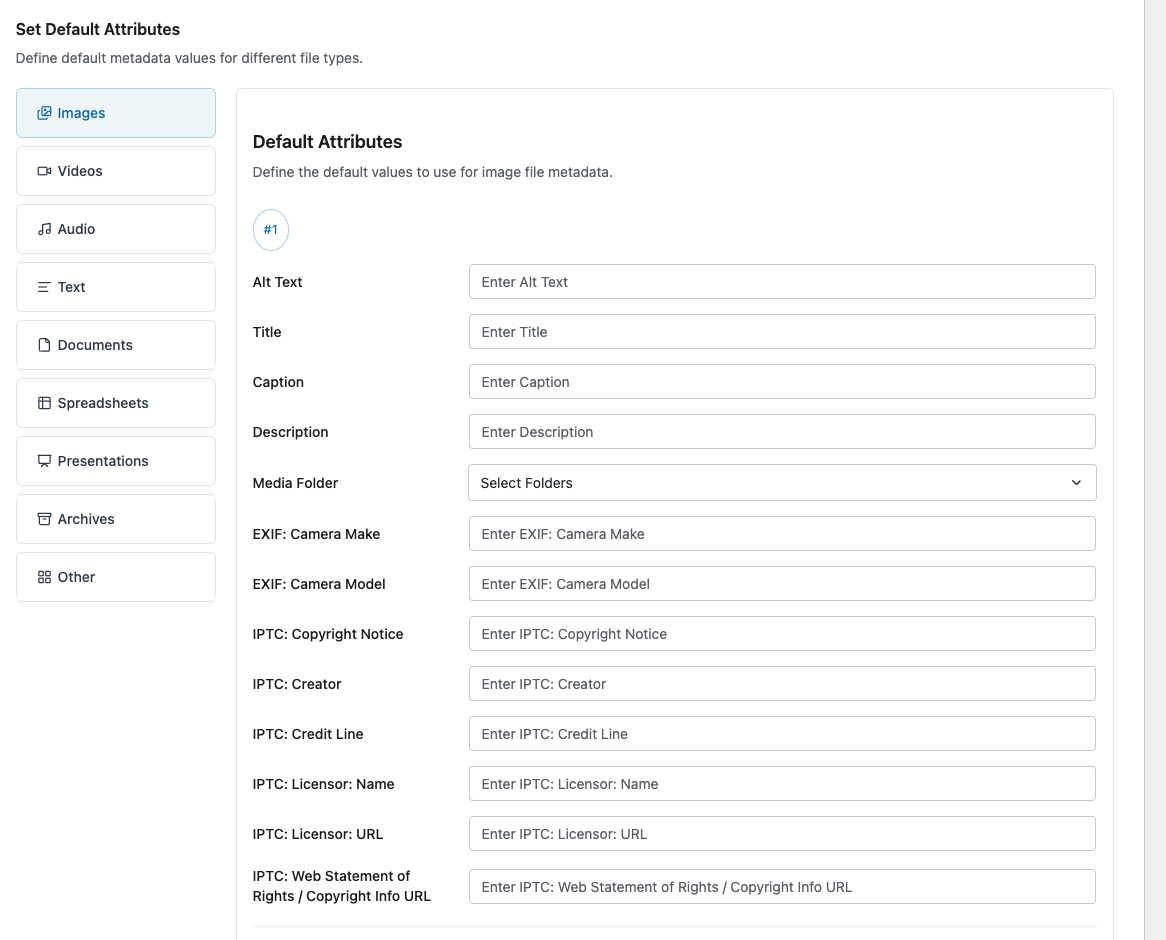 - Media Categories: Assigns the specified Media Categories to Image files uploaded to the Media Library, where no Media Categories were specified with the upload.