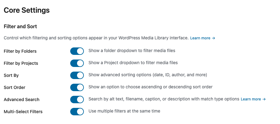 Clicking the Core settings tab will show your additional Taxonomies below the Filter by Folders option, in this screenshot, refer to Filter by Projects.