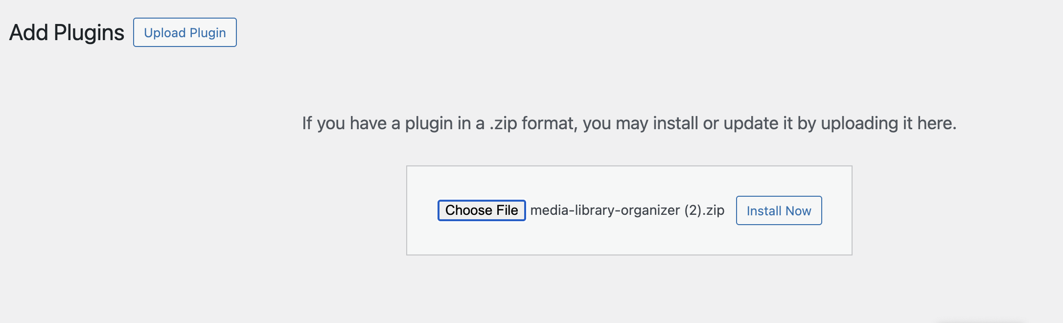 After downloading the ZIP file, go to your site plugin's page and upload the ZIP file you just downloaded to install the Media Library Organizer PRO.