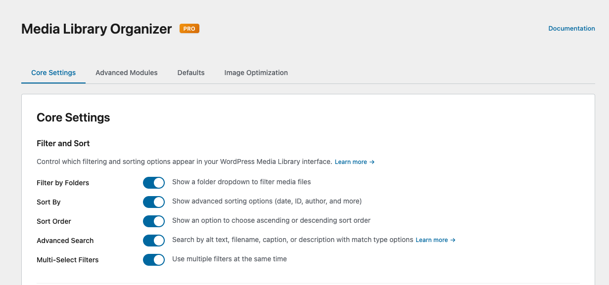 By default, these are all enabled when Media Library Organizer is installed and activated on your WordPress web site. Use this screen to change the settings at any time: