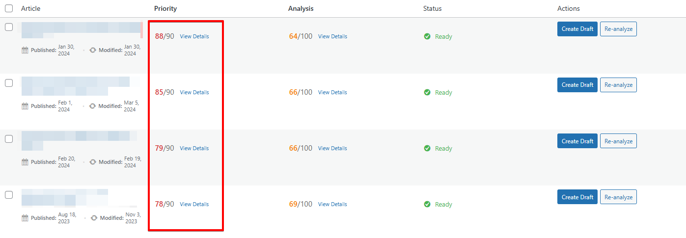 - Data-driven: Priority scores help you focus on content where updates will have the biggest impact.