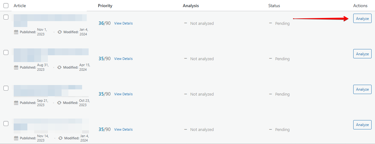 Pro tip: You can analyze multiple posts at once using bulk actions. Just check the boxes next to several posts and select Analyze Selected from the bulk actions dropdown.