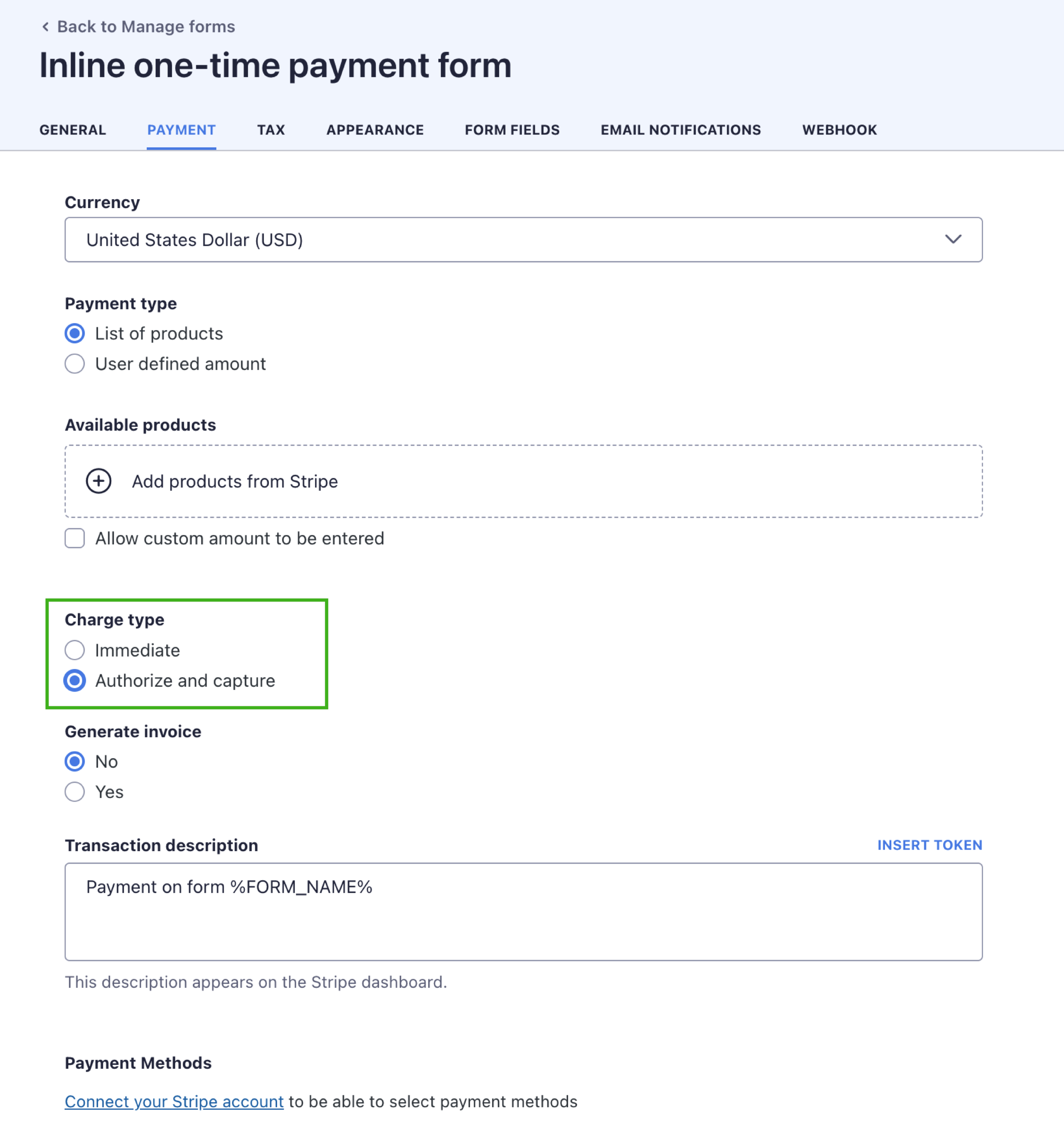 - In the payment settings, select Authorize and Capture as the Charge type.
