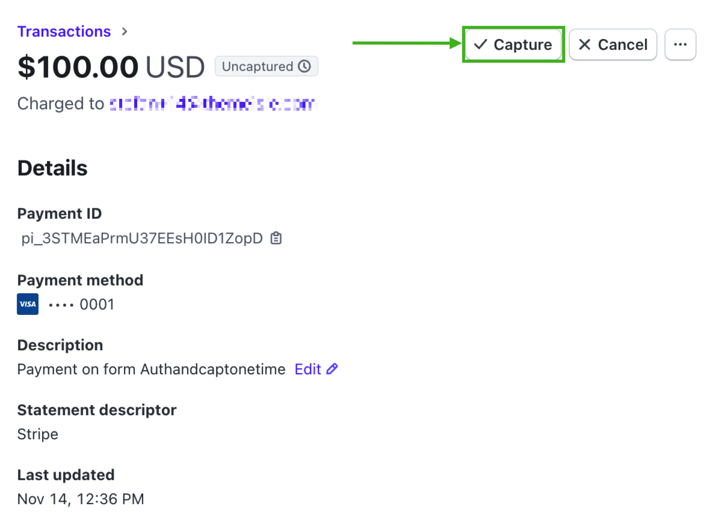 To complete the charge, open the payment in Stripe and click the Capture button.