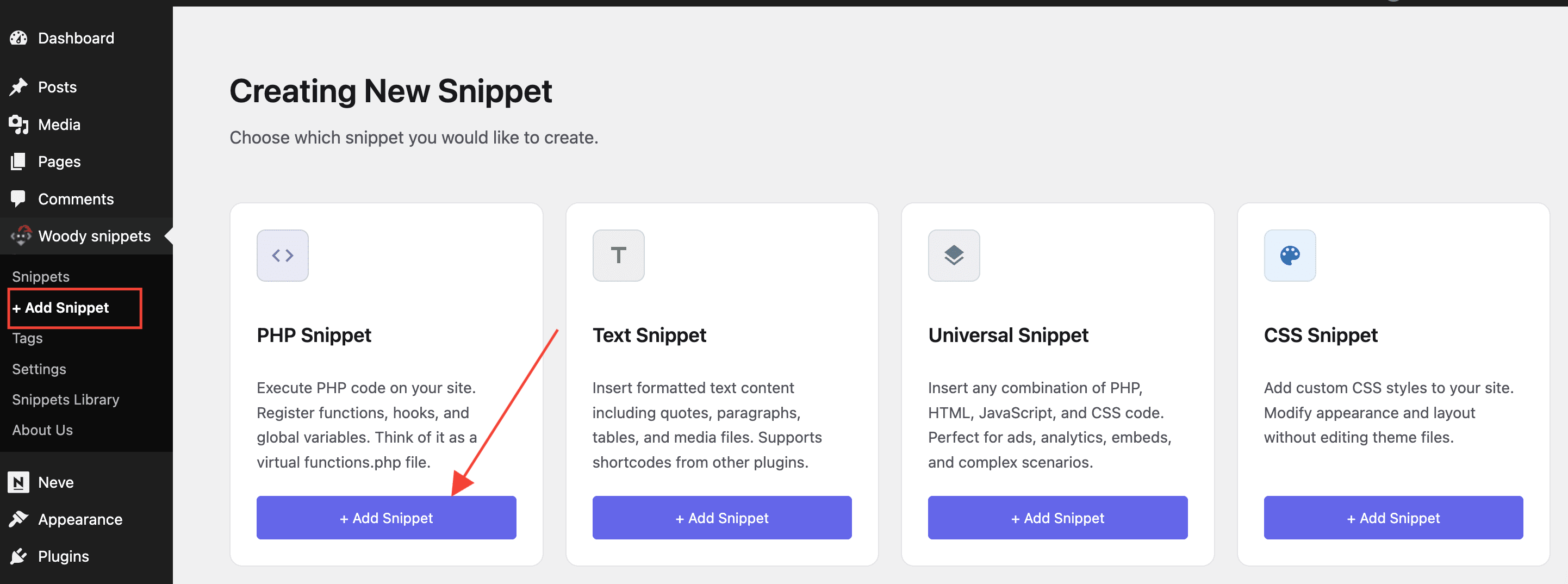 Select PHP Snippet as a snippet type and click Add Snippet. The snippet settings will be opened.