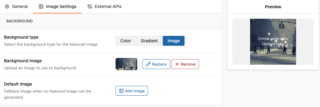 To configure the background you need to go to Auto Featured Image > Settings > Image Settings
