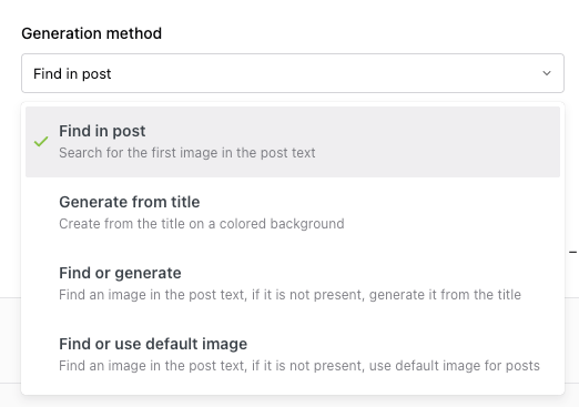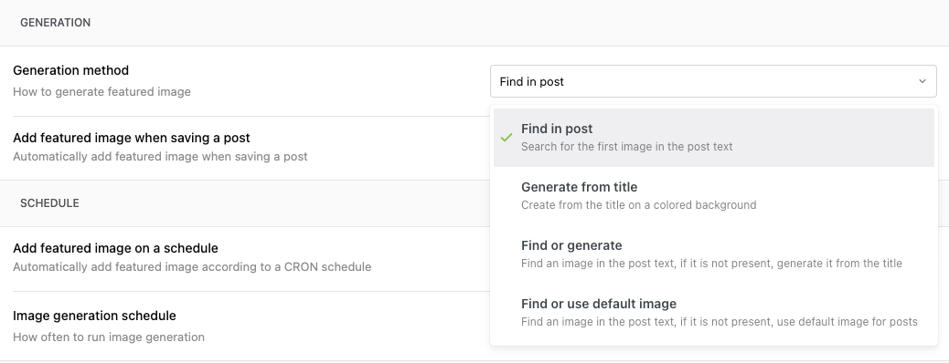 Find or Generate - It tries to find images in content, if it is not present then it generates from Title