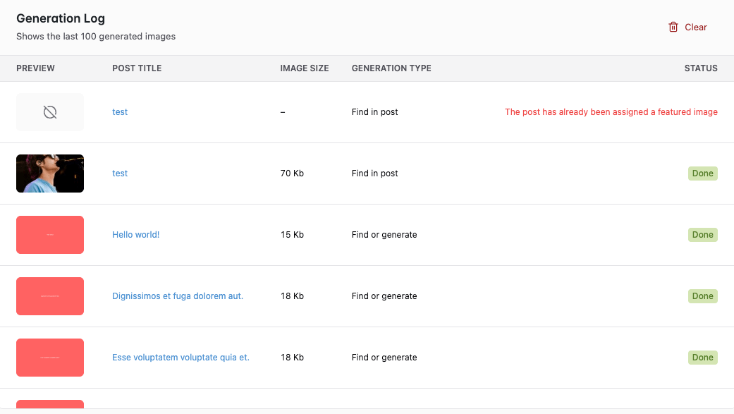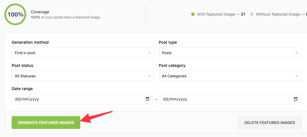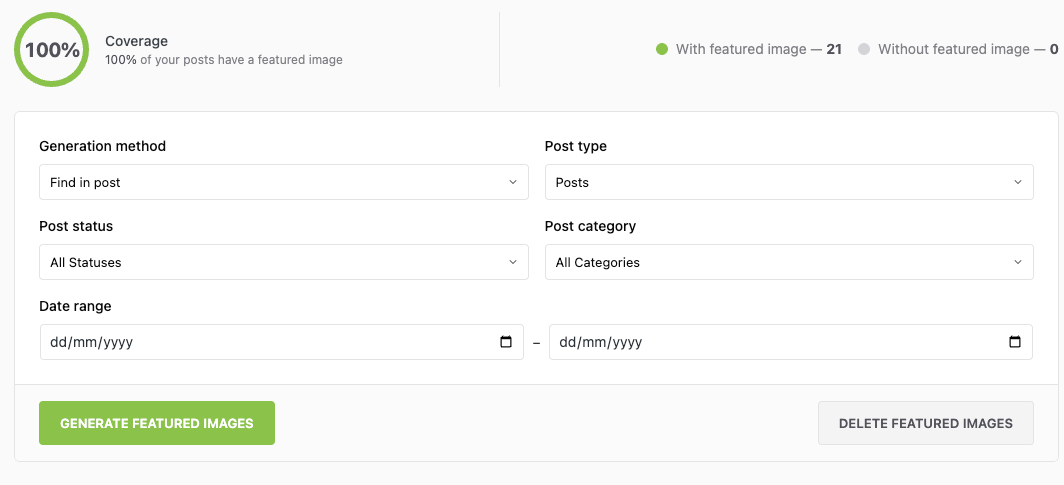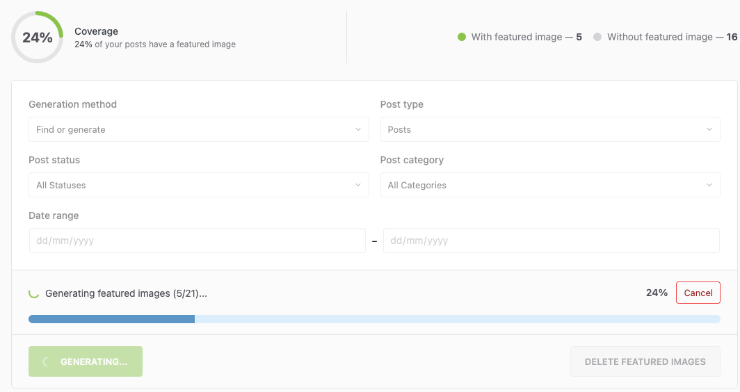 The Bulk Generation tool processes multiple posts simultaneously, adding featured images to posts that don't have them. Essential for sites with existing content libraries.