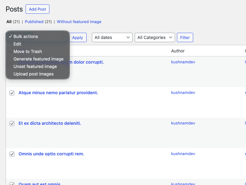 3. Choose "Generate Featured Images" from Bulk Actions dropdown