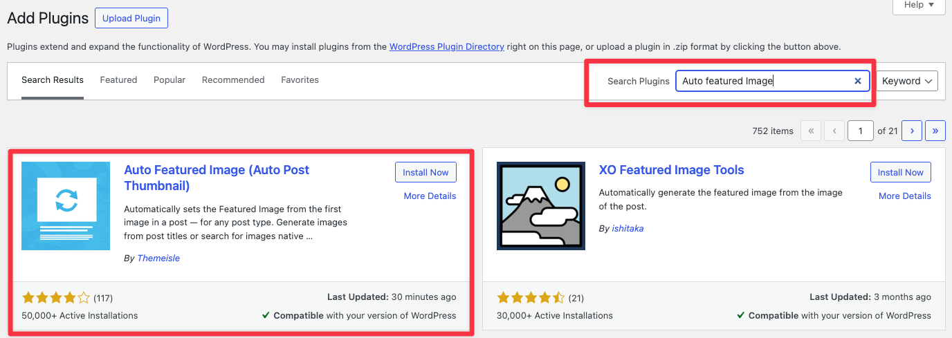 In your WordPress Dashboard, navigate to Appearance > Plugins > Add Plugin. Enter the plugin name Auto Featured Image in the search bar.