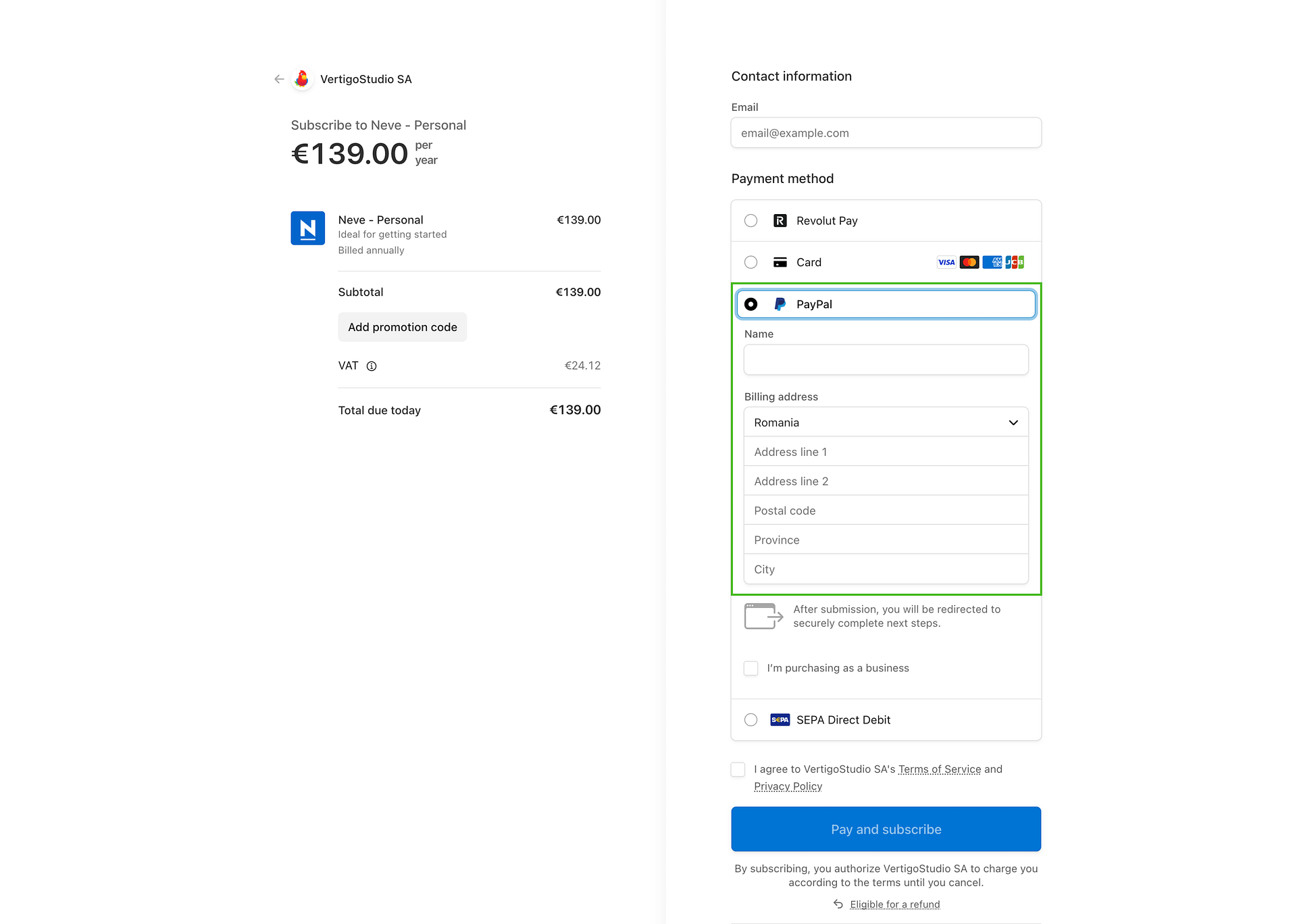 We use Stripe as the payment processor for all new subscriptions. After choosing the desired plan (for example, for the Neve theme, choose a plan on this page), the Stripe Checkout page will show the available payment methods for your country, including PayPal.
