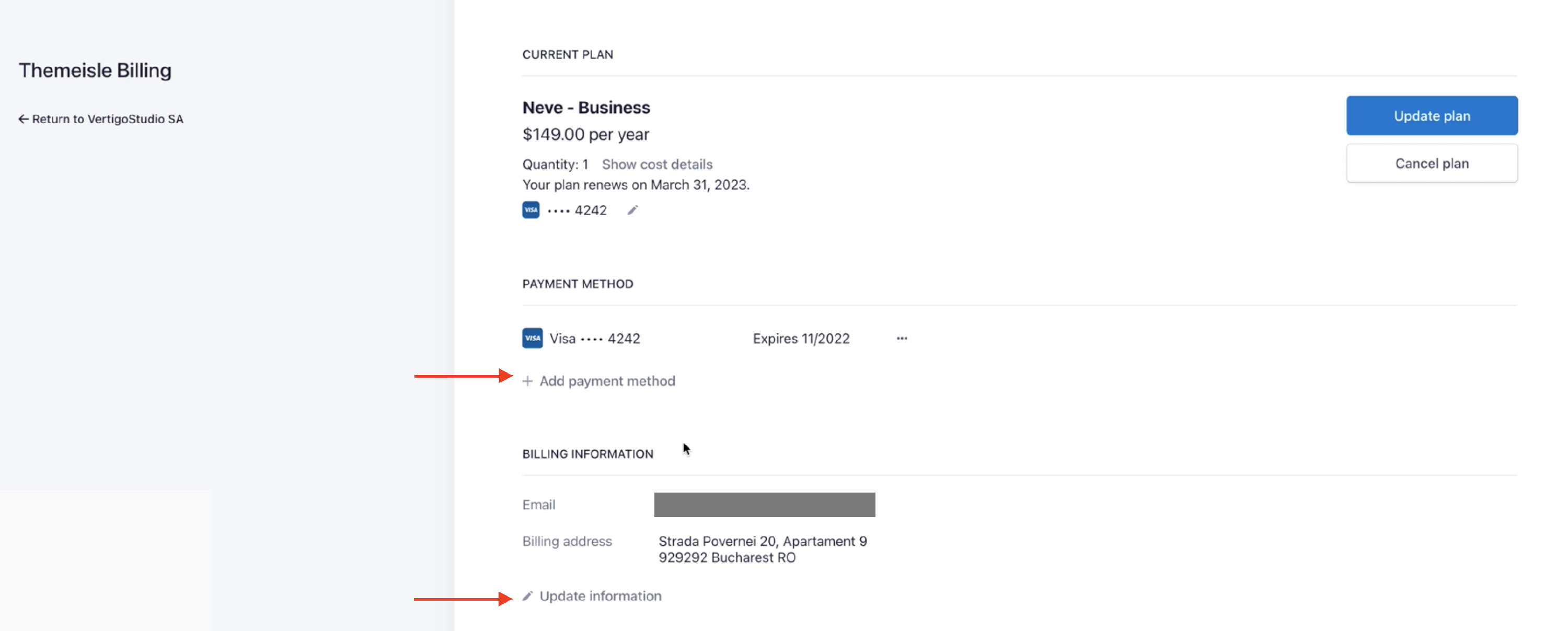 3 You will be redirected to the Stripe portal, from where you can update payment details.