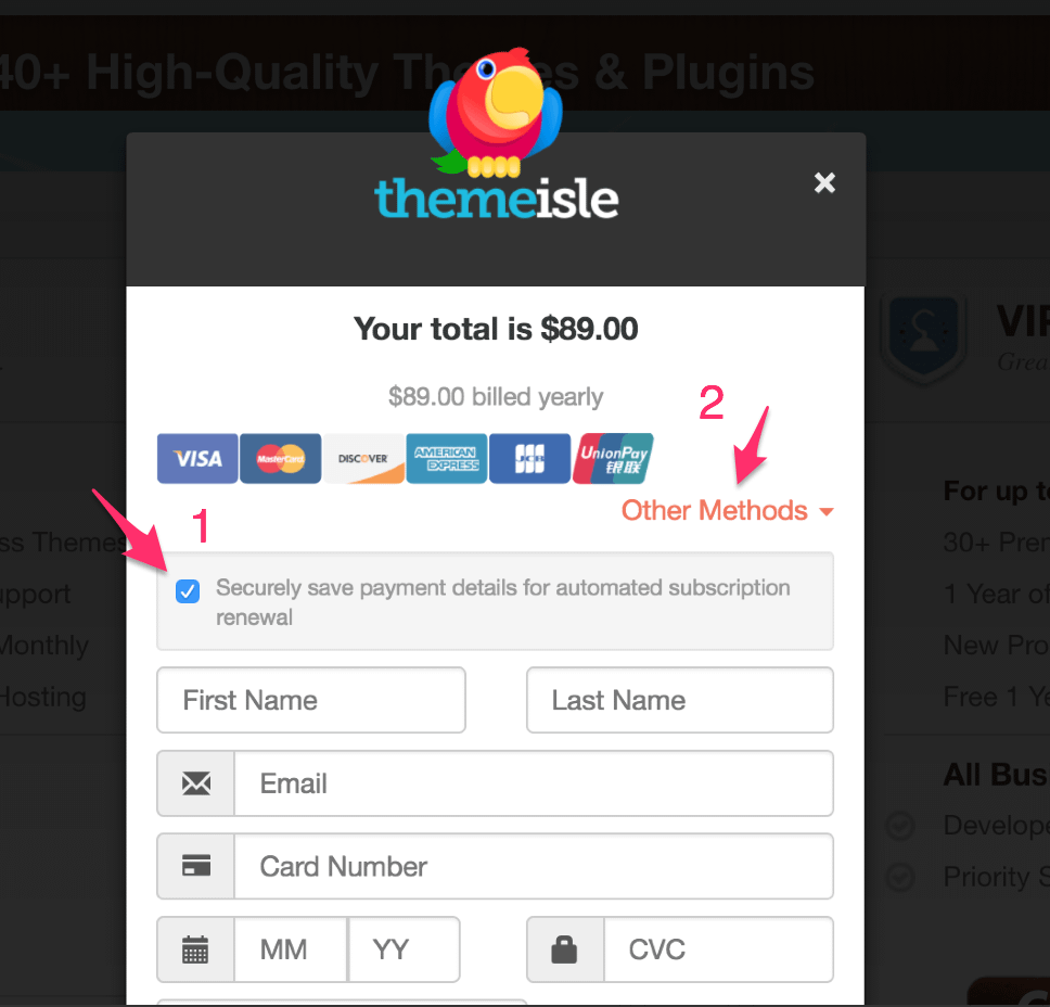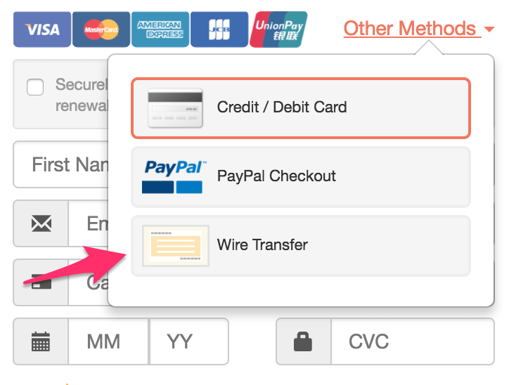 Thank you for your trust and because you have chosen our products. Due to our FastSpring payment system, you can now pay by Wire Transfer (bank transfer). To achieve that you just have to uncheck the "Automatic renewal payment" box and click on "Other methods"