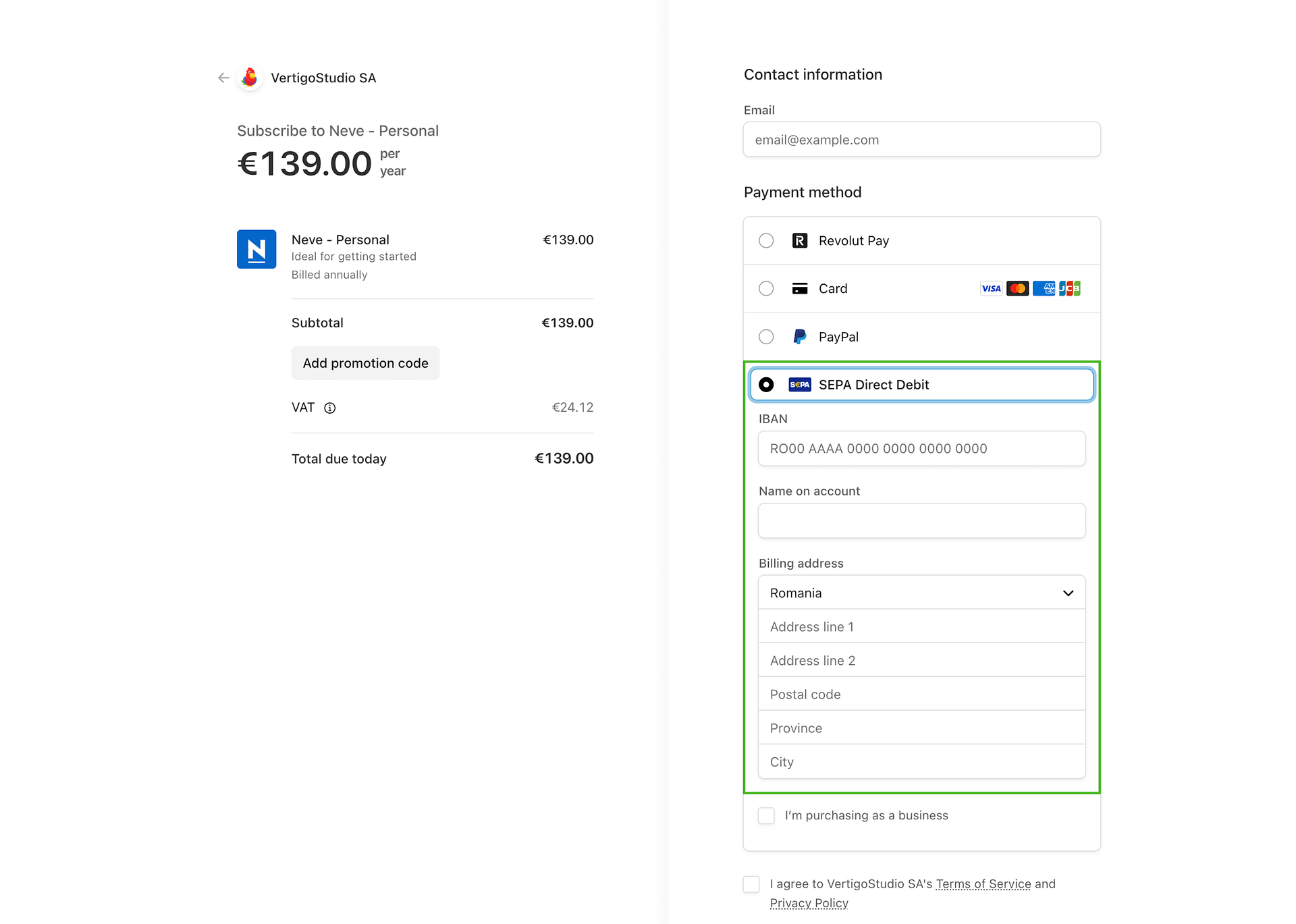 We use Stripe as the payment processor for all new subscriptions. After choosing the desired plan (for example, for the Neve theme, choose a plan on this page), the Stripe Checkout page will show the available payment methods for your country.