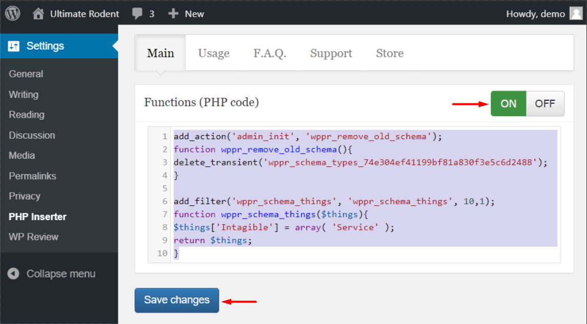 Then, install and activate the My Custom Functions plugin which allows you to add the PHP snippet which is required to enable the schema.org intangible services.