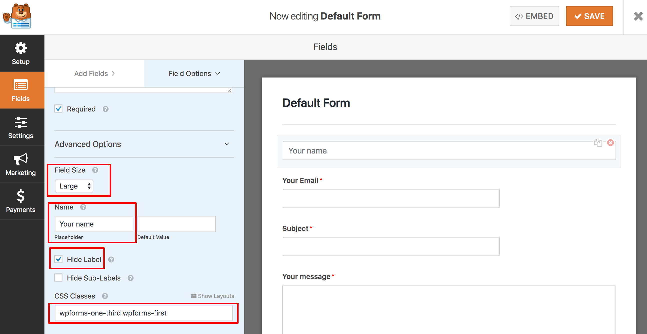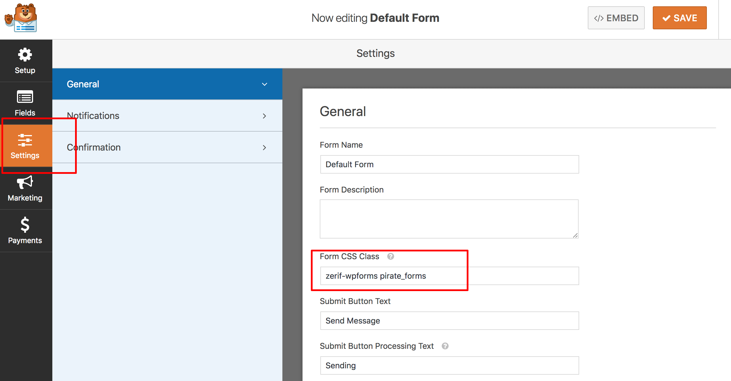 6. Go to the Settings tab, and make sure you add for Form CSS Class: zerif-wpforms pirate-forms