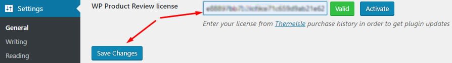 6 After activation, navigate to Settings->General and scroll down until you see the WP Product Review license input.
