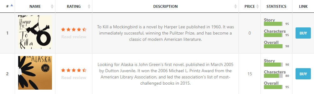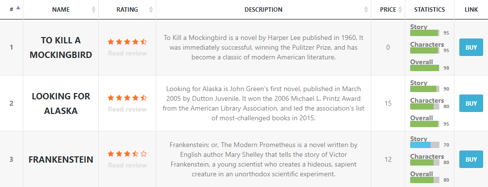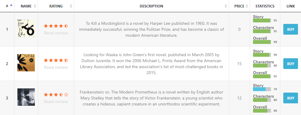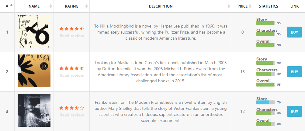 This basic shortcode displays a table with all your reviews listing their name, rating, description, price, statistics and the affiliate button.