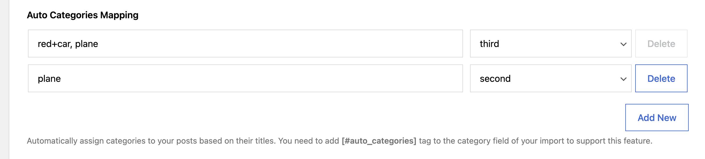 plane, trainwill assign the category if either "plane" or "train" is found in the title. - Plus (`+`): Acts as an AND condition. For example,
