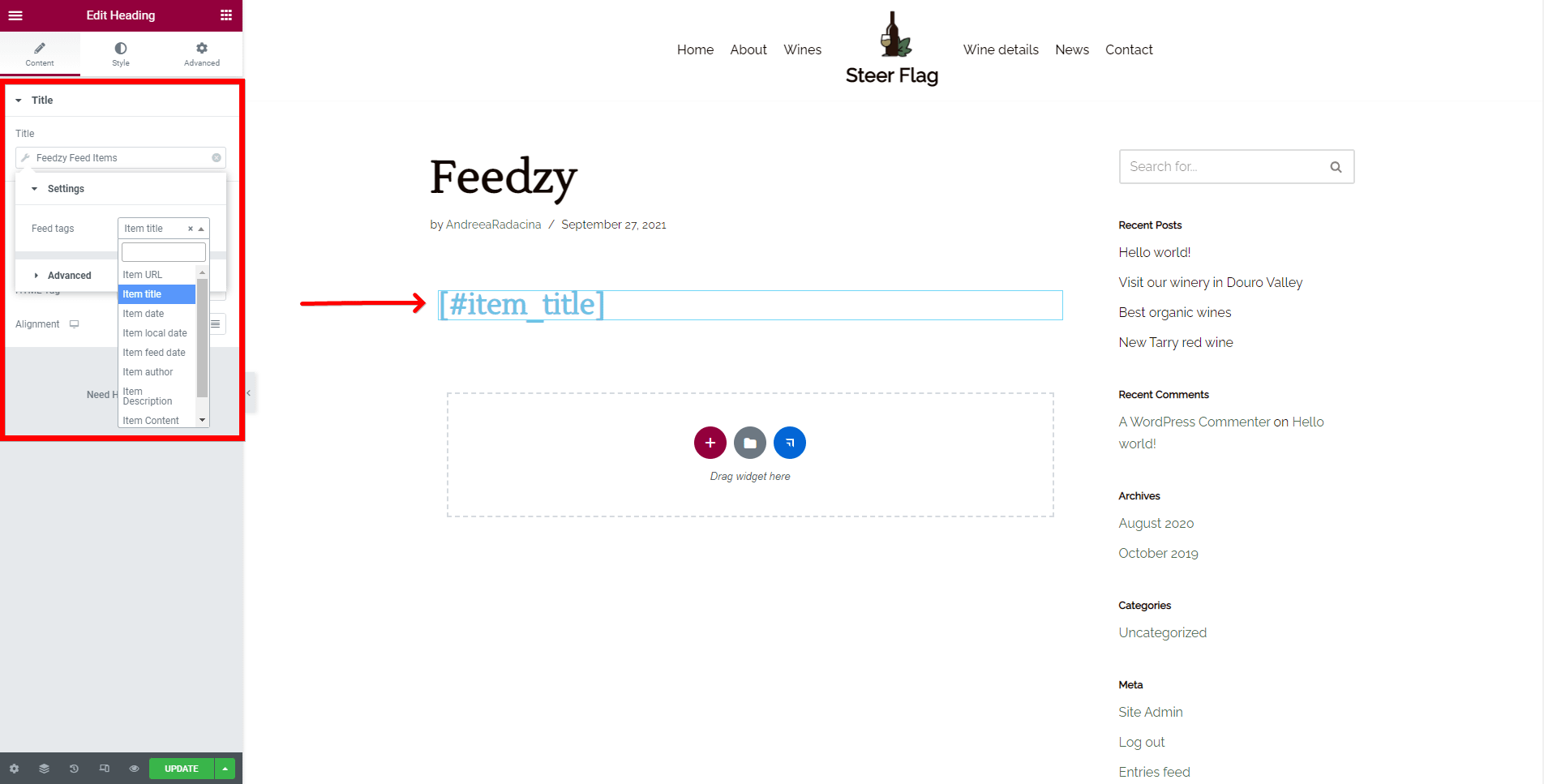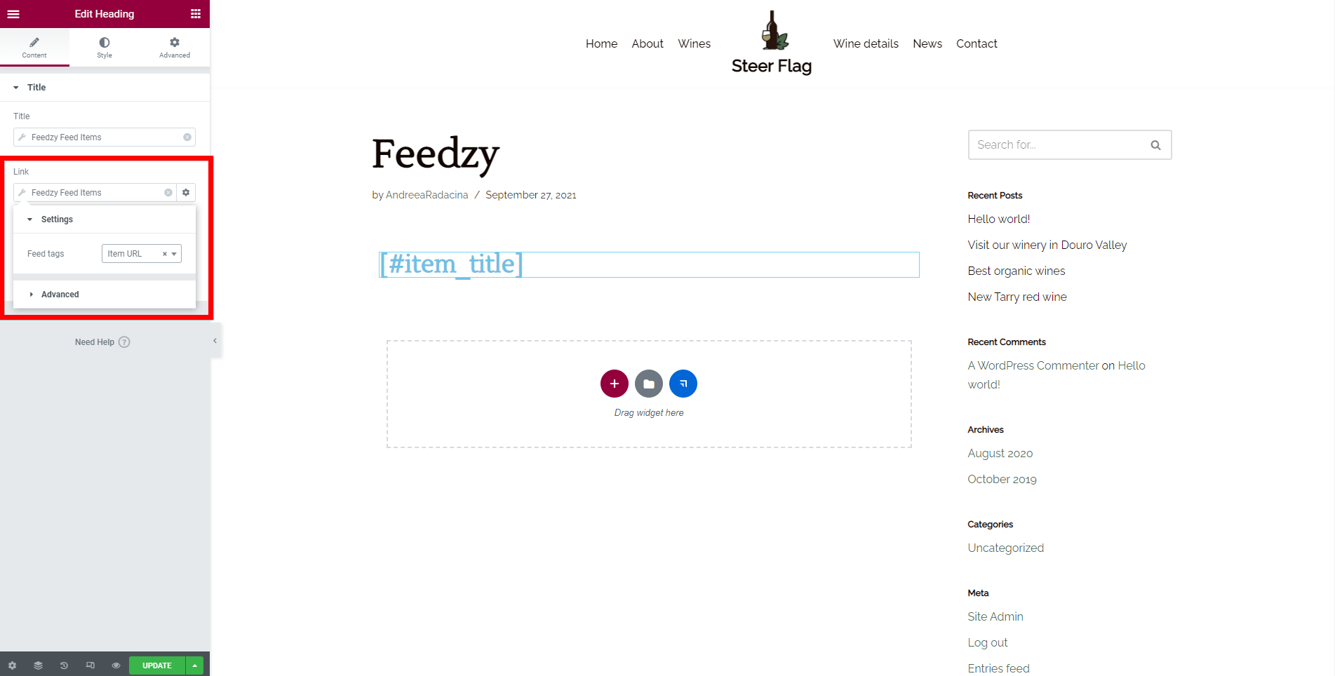 Start the customization, using the dynamic tag's value, from the Settings menu of the Feedzy Feed Items.
