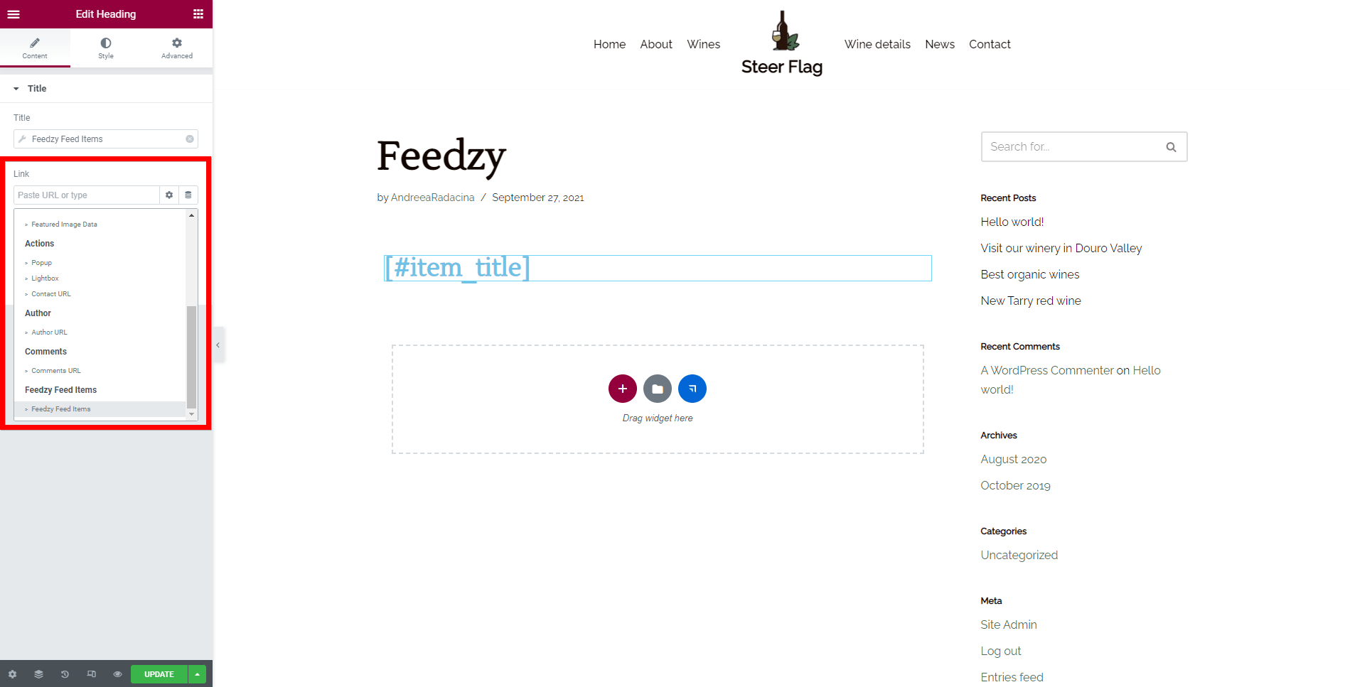 In order to create a Feedzy related template, use the dynamic tags from the end of the field icon and scroll until the Feedzy Feed Items label.