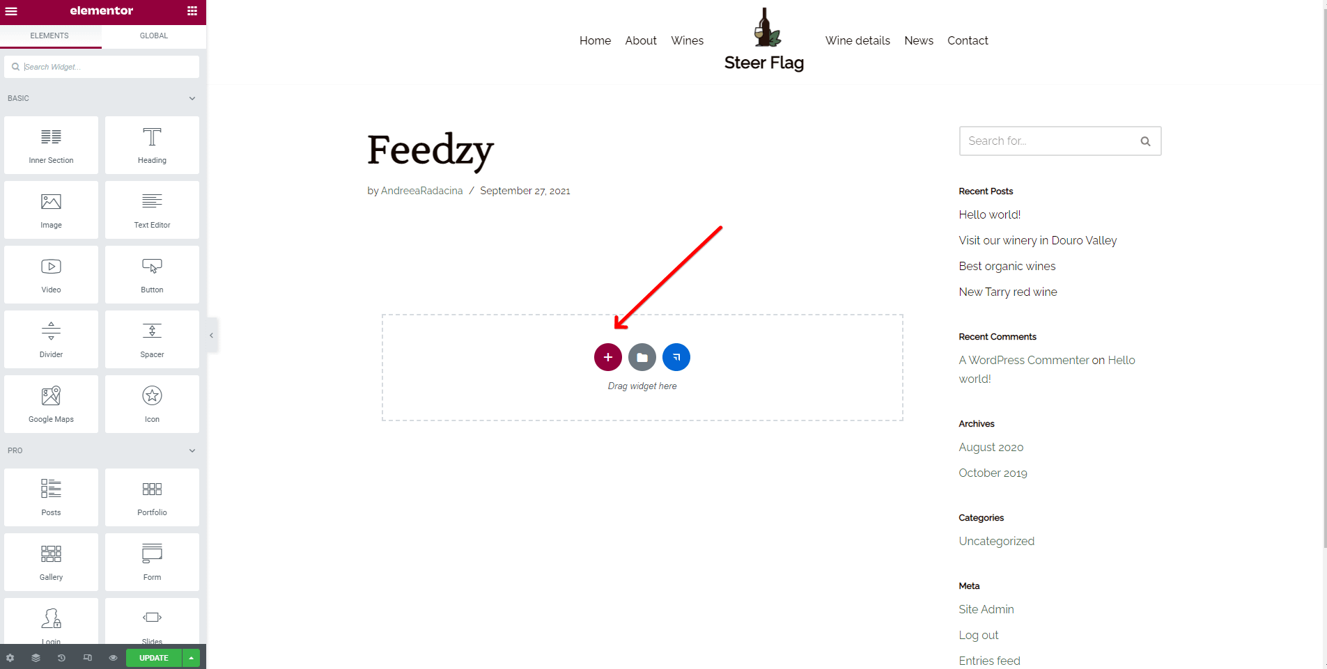 When the Elementor editor opens, click on the ➕ button from the widget area, and add the Feedzy Loop component.