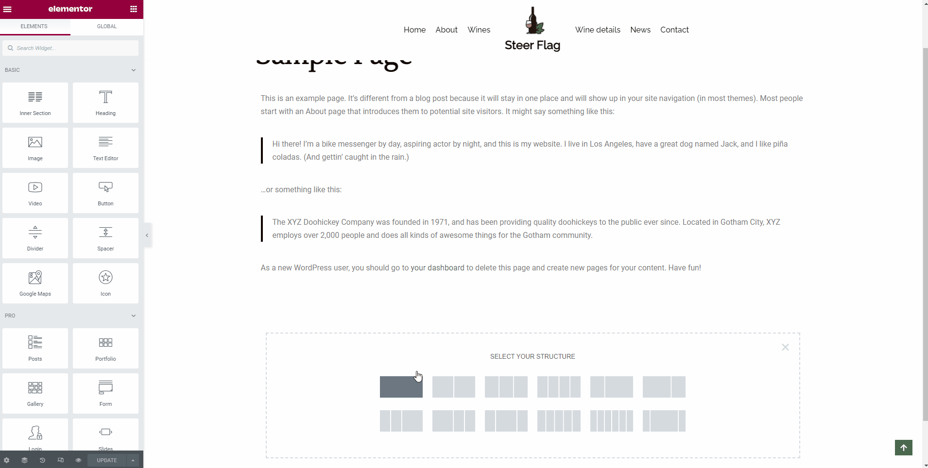 Select the structure ( one column ) and choose the elements ( as in the list below ), according to the desired aspect.