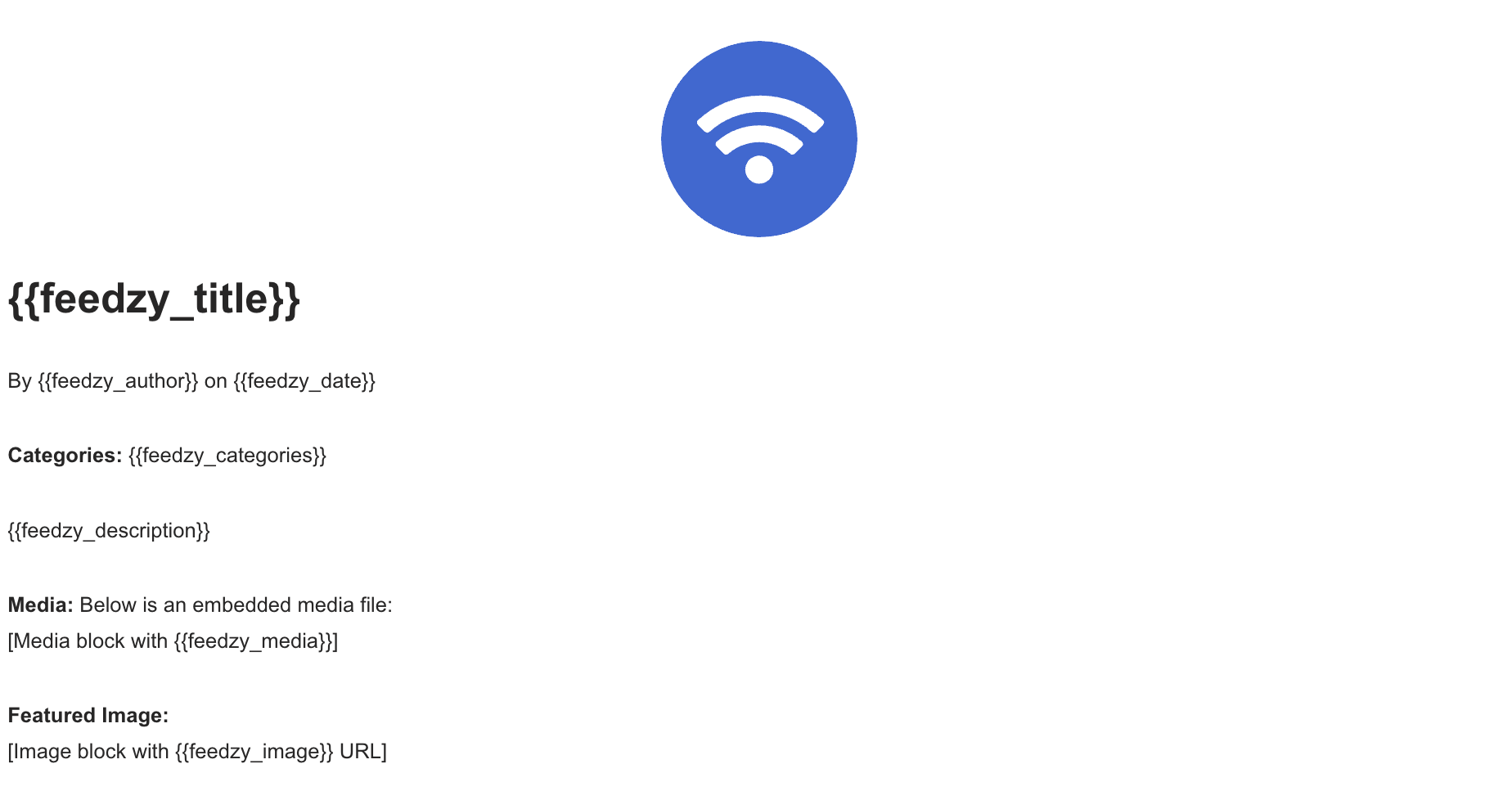 {{feedzy_title}}: Displays the title of the RSS feed item.{{feedzy_url}}: Provides the URL of the RSS feed item.{{feedzy_date}}: Displays the publication date of the item.{{feedzy_time}}: Displays the publication time of the item.{{feedzy_datetime}}: Combines the date and time of publication.{{feedzy_author}}: Displays the author's name.{{feedzy_description}}: Shows the item's description.{{feedzy_content}}: Displays theΒ content of the item.{{feedzy_meta}}: Provides meta information about the item.{{feedzy_categories}}: Displays the categories of the item.{{feedzy_image}}: Displays the featured image of the item.{{feedzy_media}}: Embeds media such as audio files (requires an audio block).{{feedzy_price}}: Displays the price, if available.{{feedzy_source}}: Shows the source of the feed item.