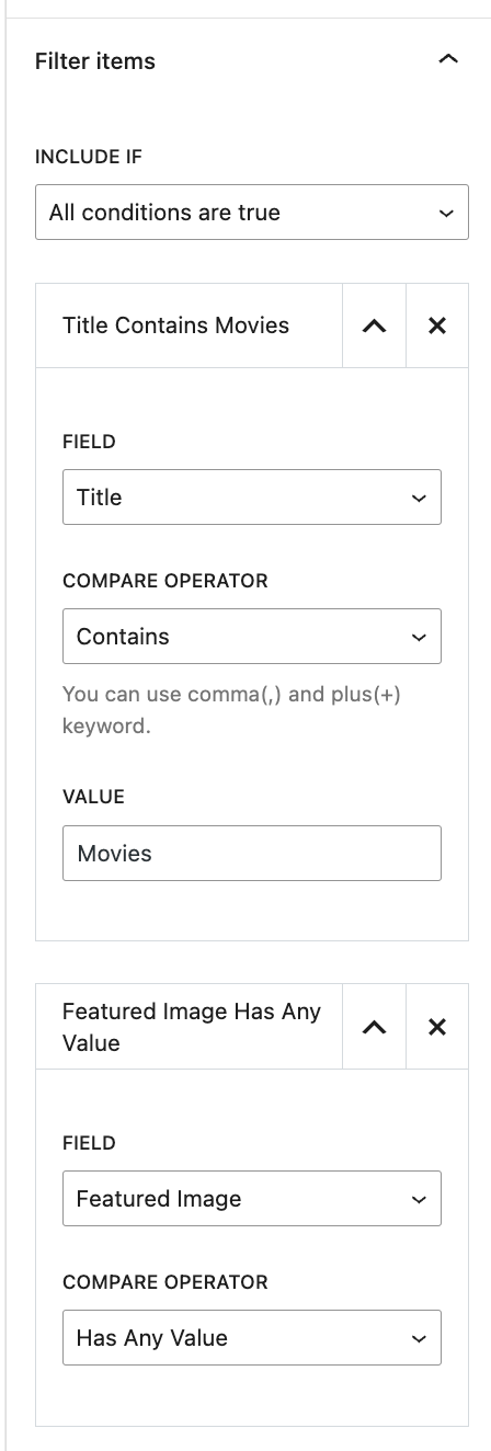 - Include If: Define whether to include posts that satisfy all conditions (All Conditions Are True) or at least one condition (Any Condition Is True).