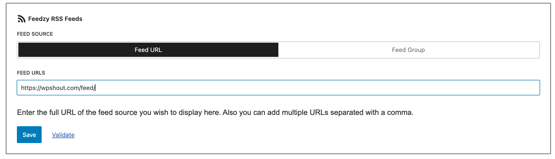 2 Select the Feed Source, either a URL or a Feed Group, to populate the block with content.