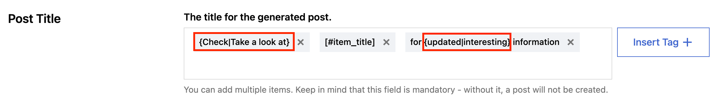 The Spintax service is very useful for blogs, as it is easily configurable and a time saver. It helps you create original content by providing a set of suitable options, and then the spintax support will pick one of them so that when the users see an article, they can see different outcomes with the same idea. In Feedzy, using a spintax requires manual configuration. You must create such a phrase with options and add it to the Post Title field or Content.