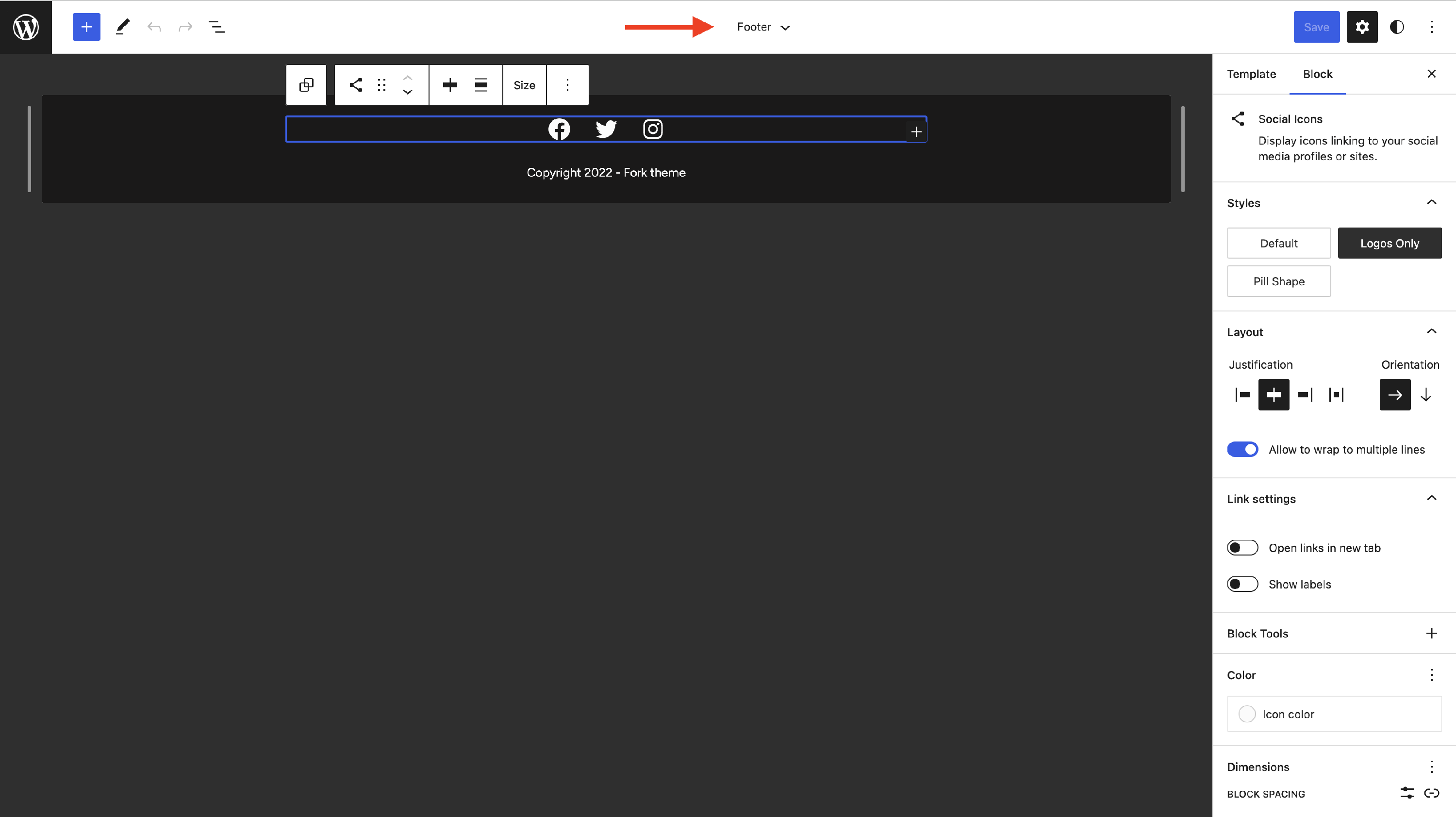 Similarly, if you open the Footer template part, you can customize it as you wish: