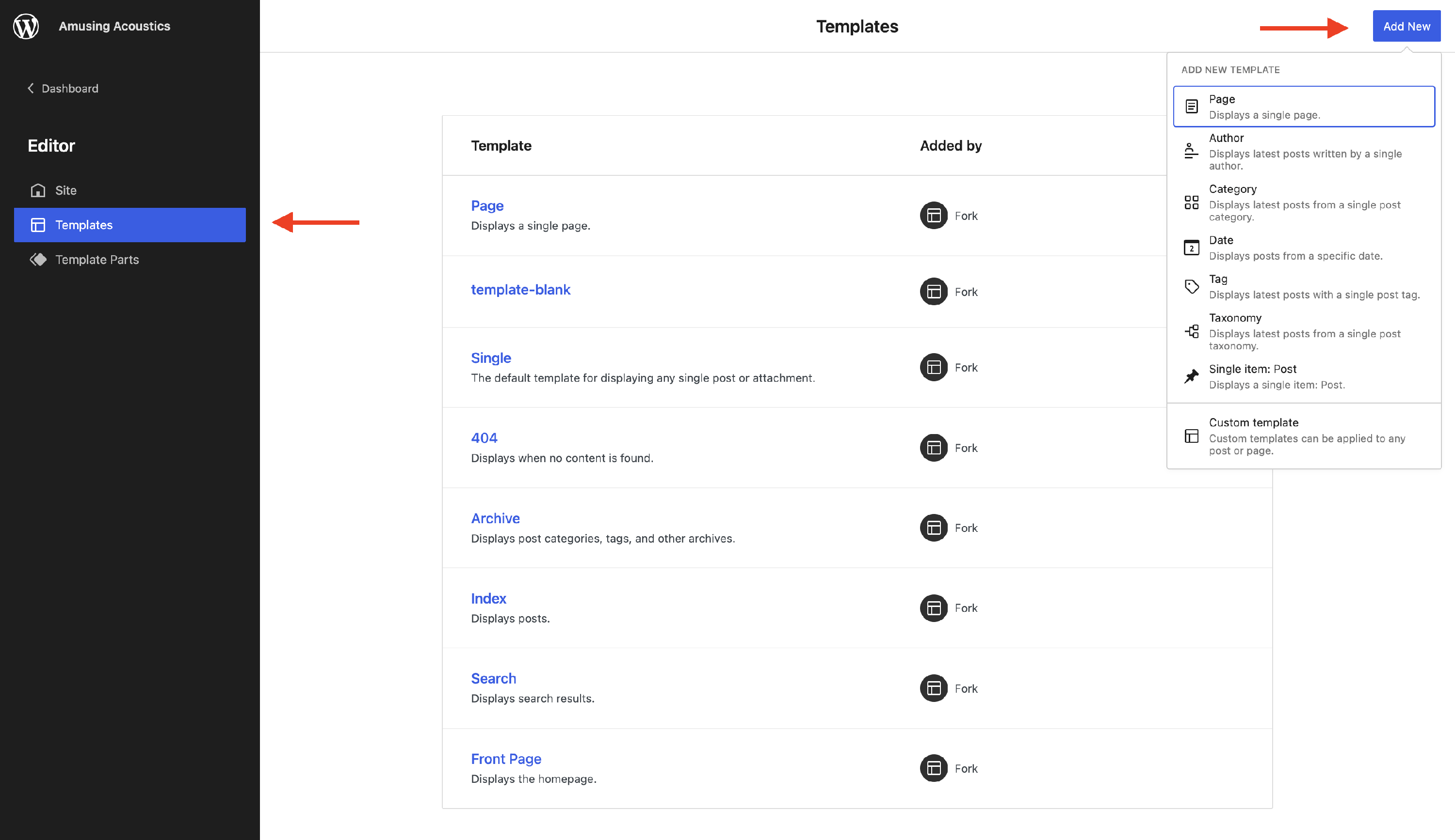 Templates can help create a structure for your website's posts, pages, or other page types. To open the templates, go to Dashboard > Editor > Templates: