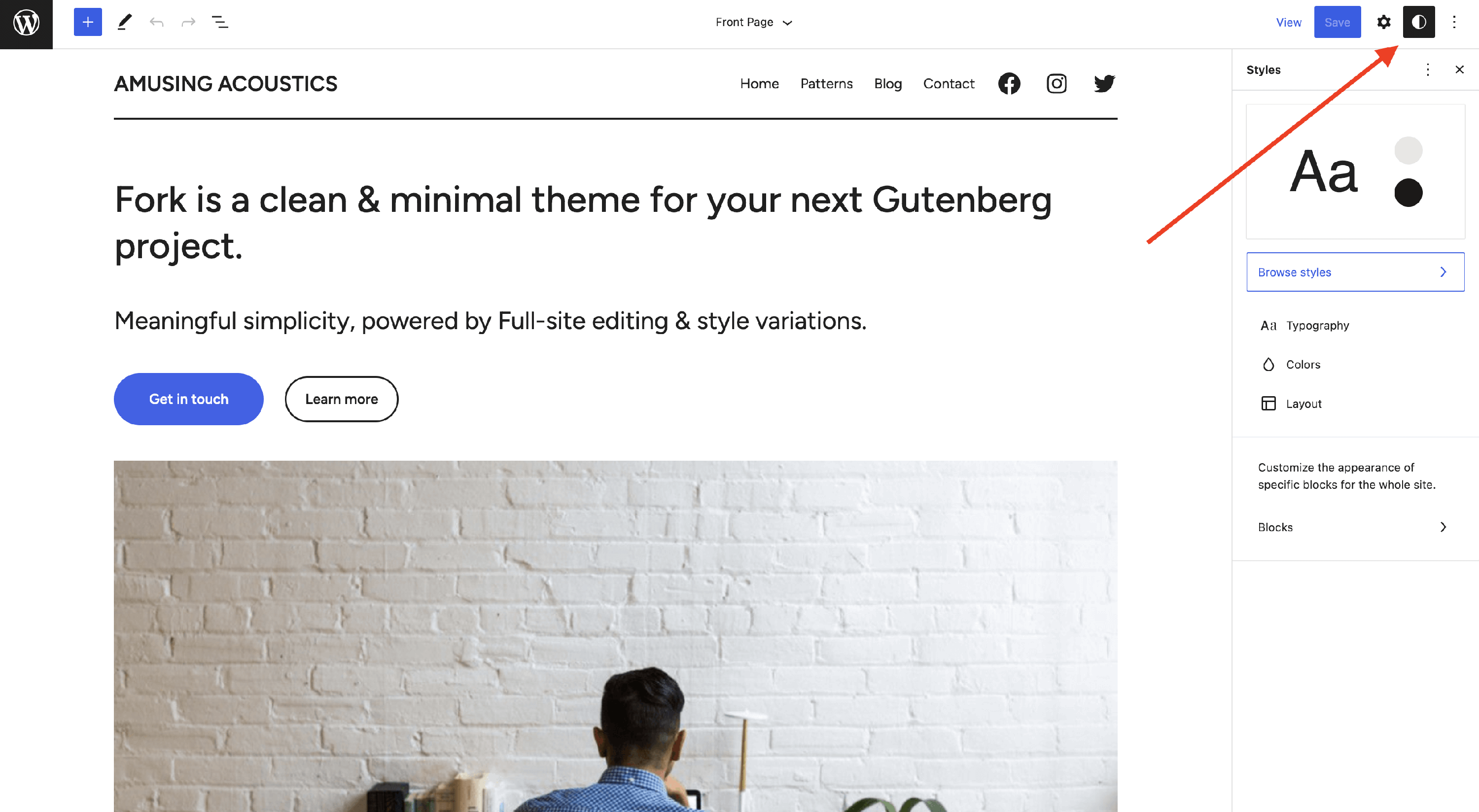 Click on the half-half circle to open the style variations, which will automatically update your website's design: