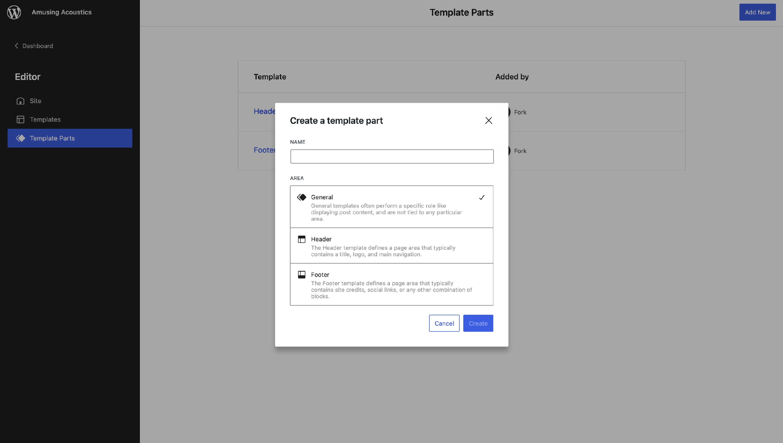 The template parts refer to the header and footer and can be found under Dashboard > Appearance > Editor > Template Part, but you can also add others: