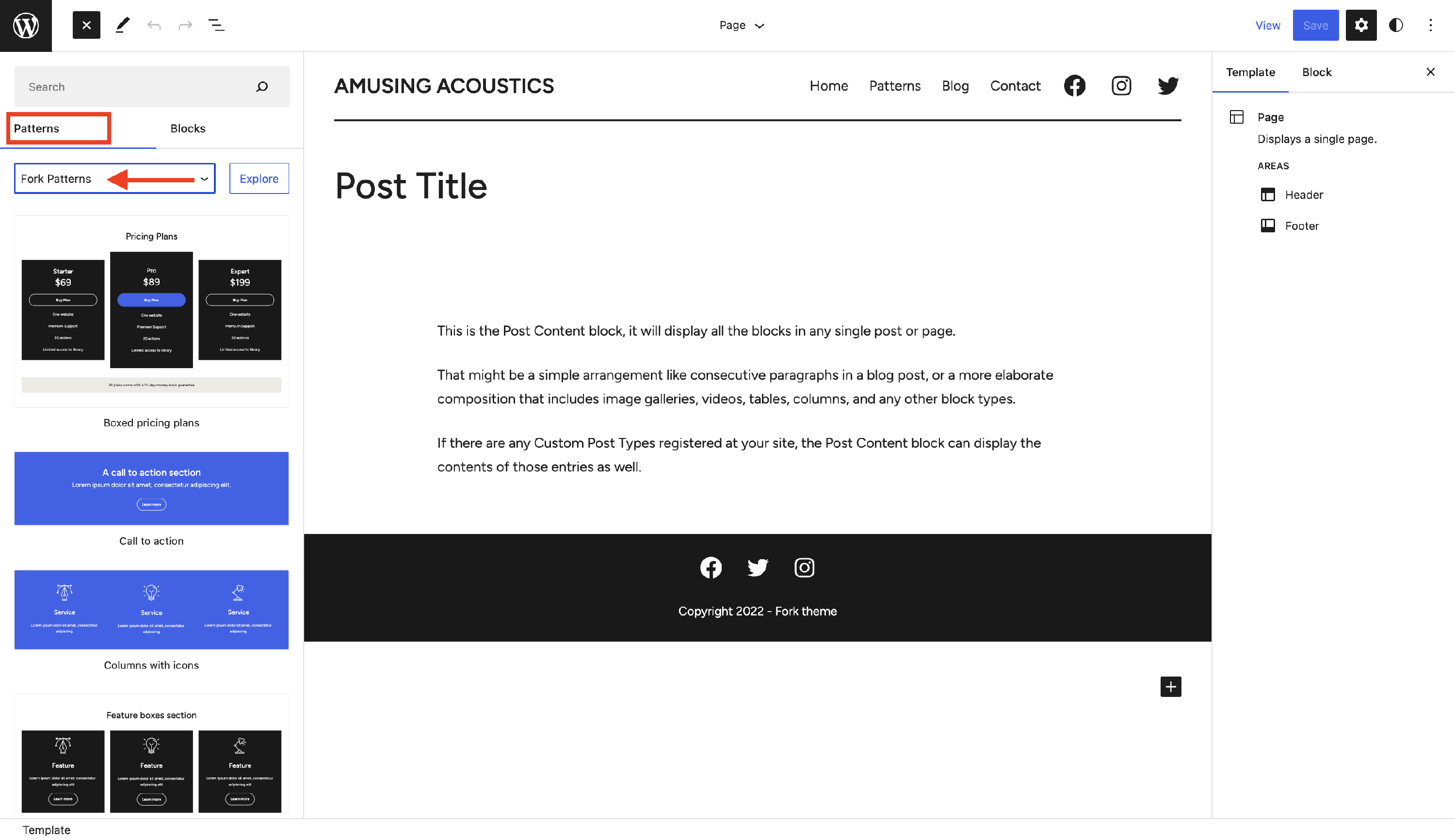 Fork adds a palette of patterns to help you create innovative layouts using predesigned sections. To open them, click on the ➕ button, and switch to the Patterns tab: