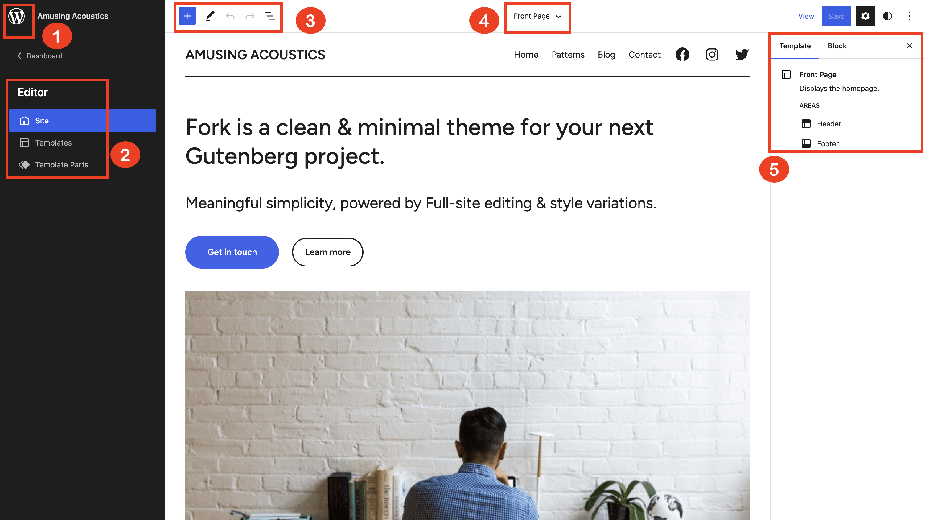 - 2 = editor - allows you to switch between the website's parts ( site = current page, templates, or template parts ).